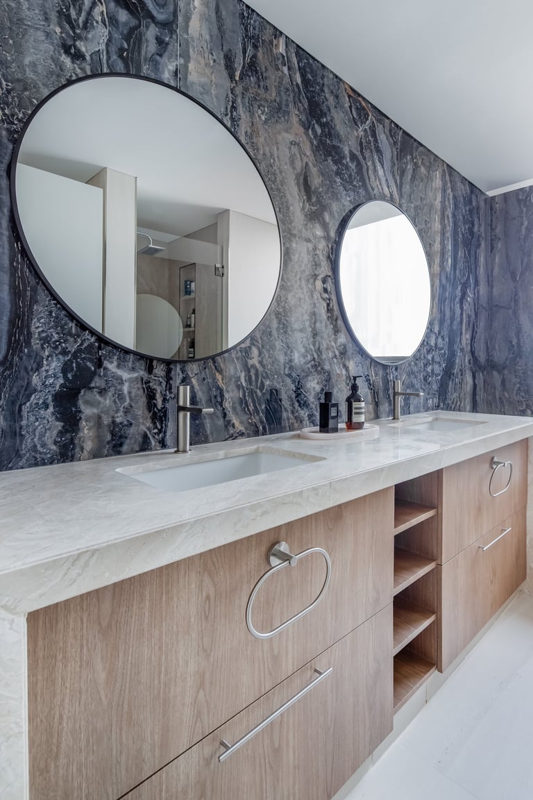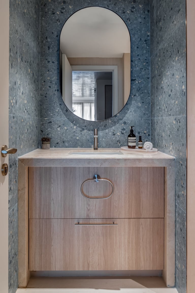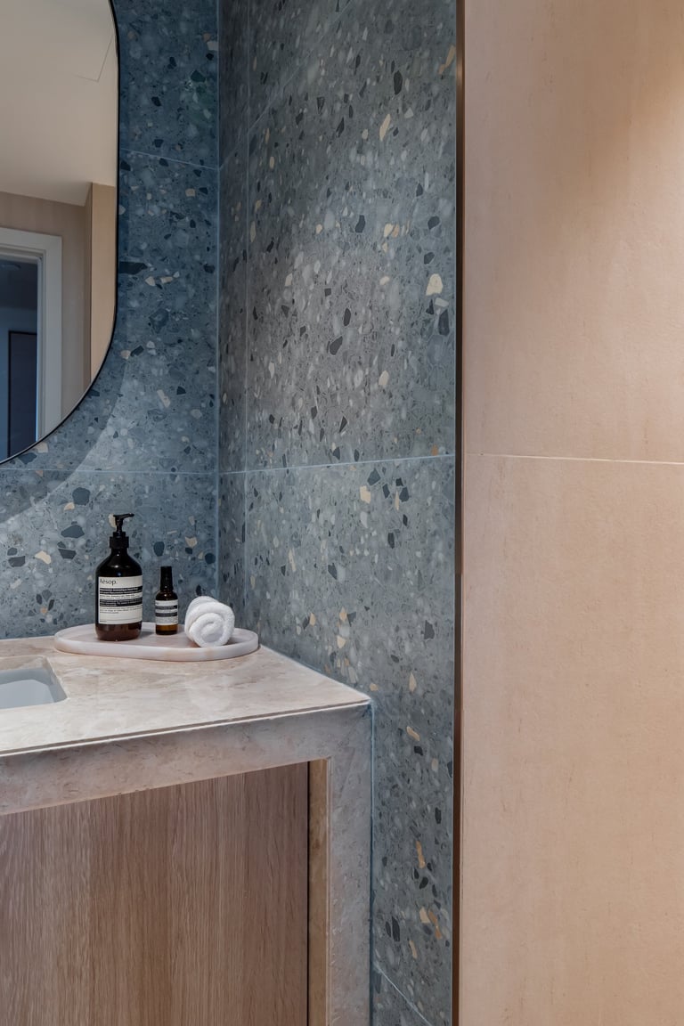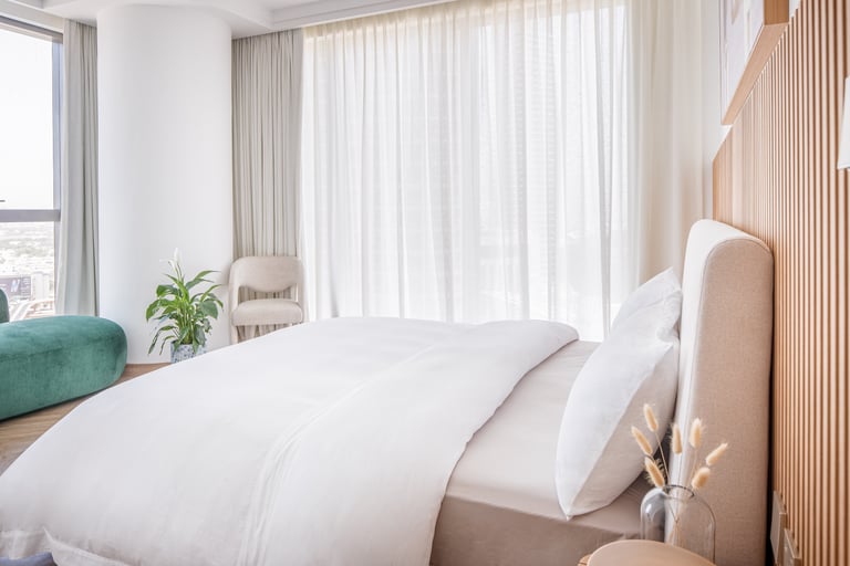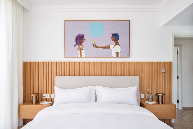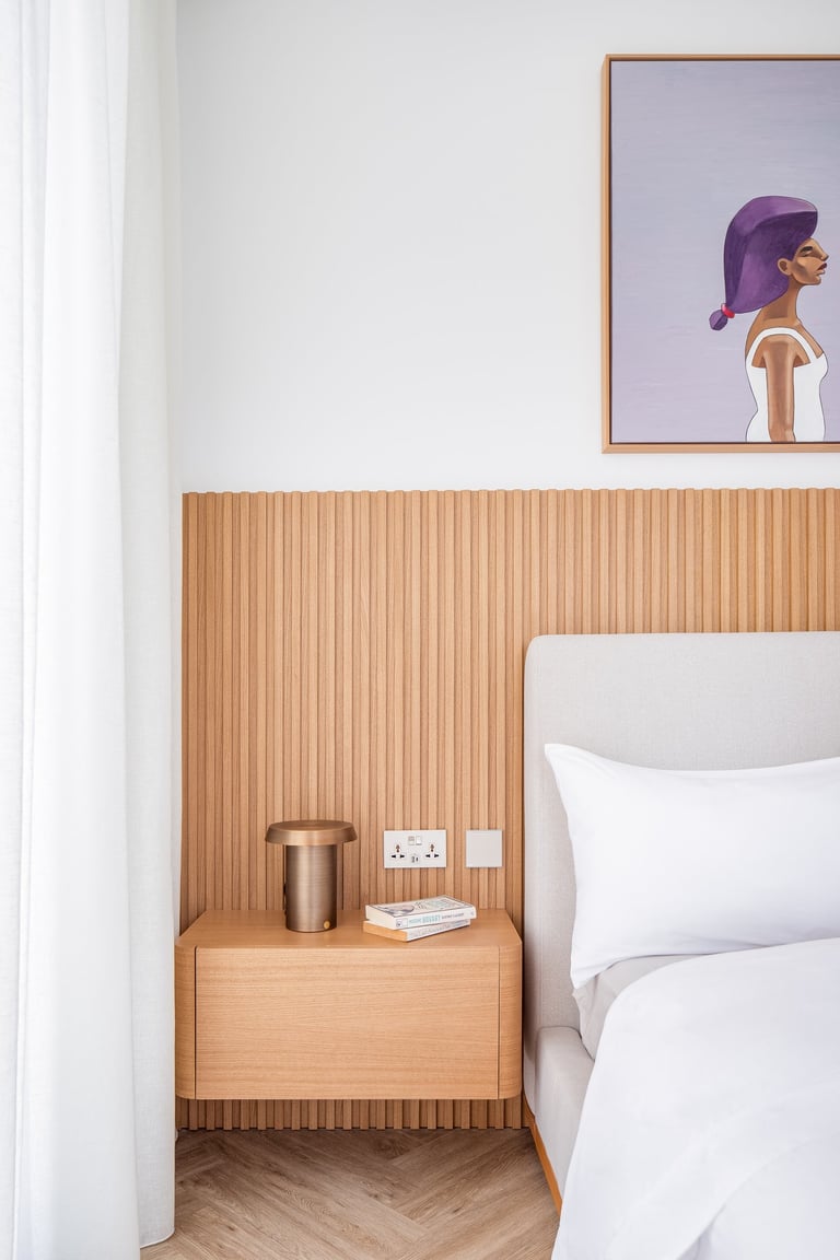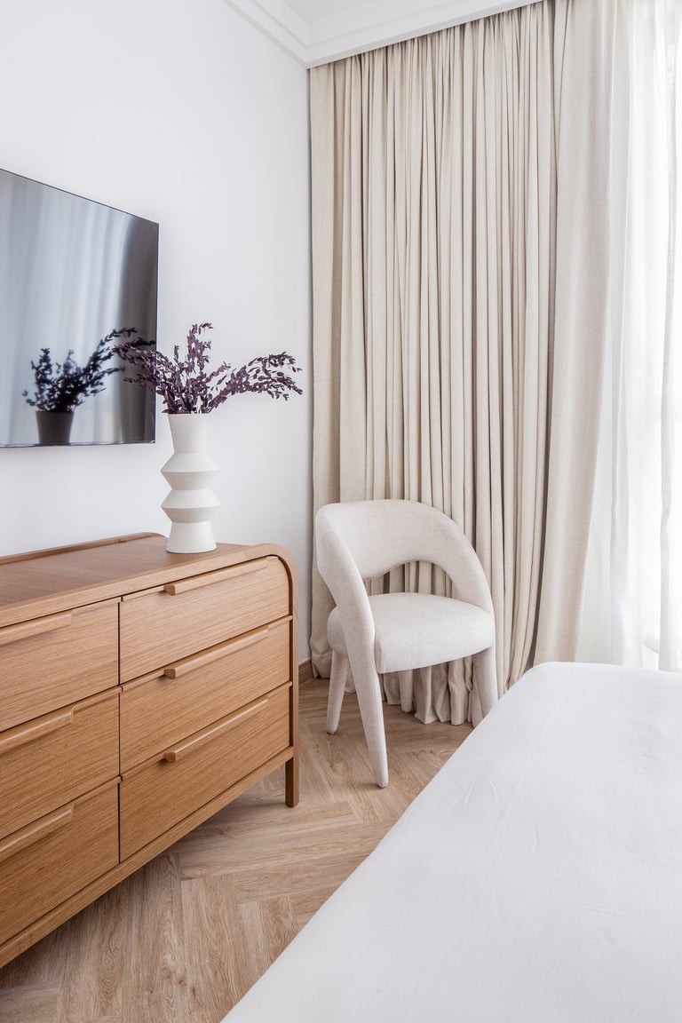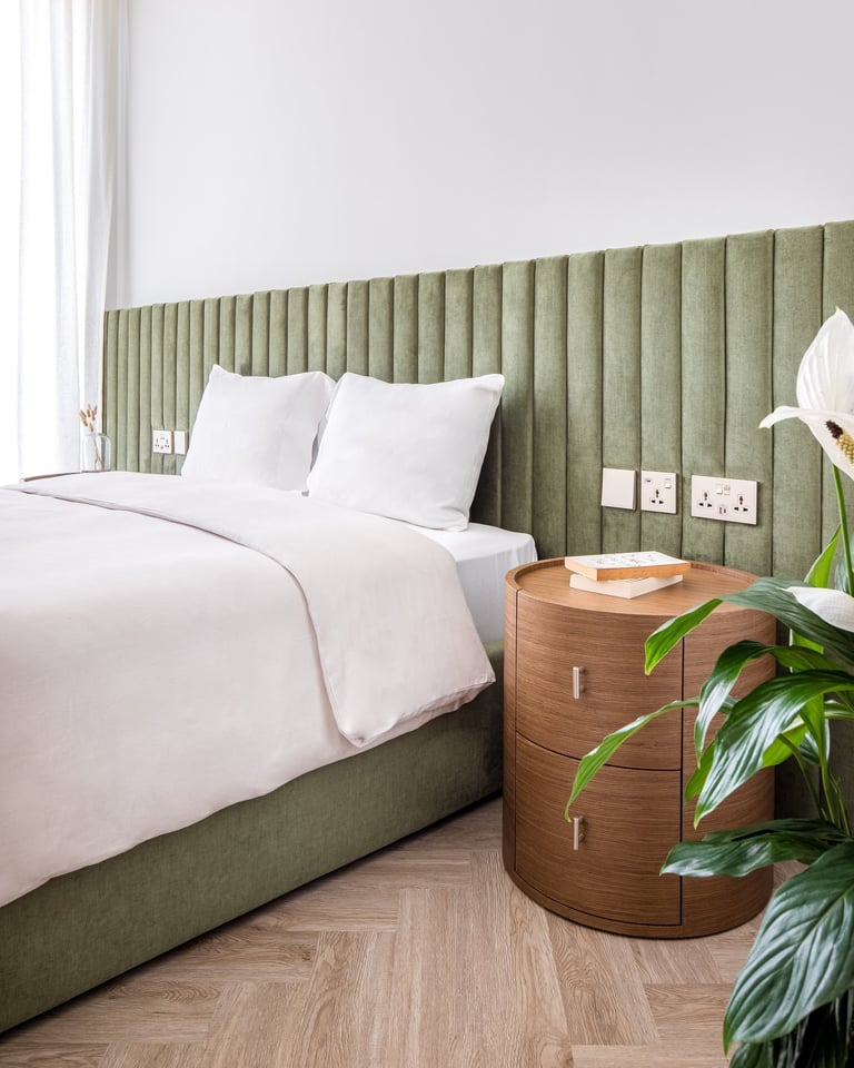 The project showcases two distinct bedroom designs, each tailored to reflect the owners’ personalities and lifestyle. The master bedroom showcases warm wood tones, fluted detailing, and a custom artwork that adds a personal and refined touch. Its layered textures and soft palette create a space that feels both elegant and inviting. The second bedroom introduces olive-green velvet accents and natural finishes, evoking a sense of calm and connection to nature. Together, the two rooms balance individuality and harmony through thoughtful design and material choice.
