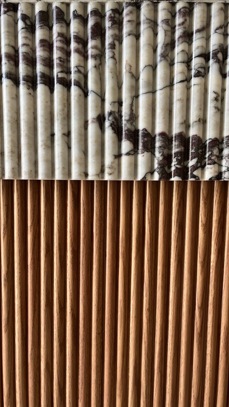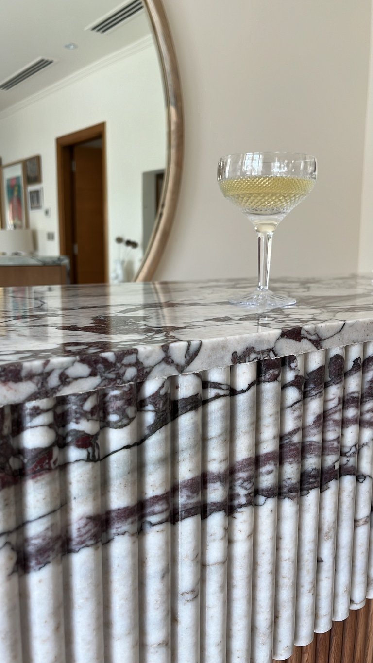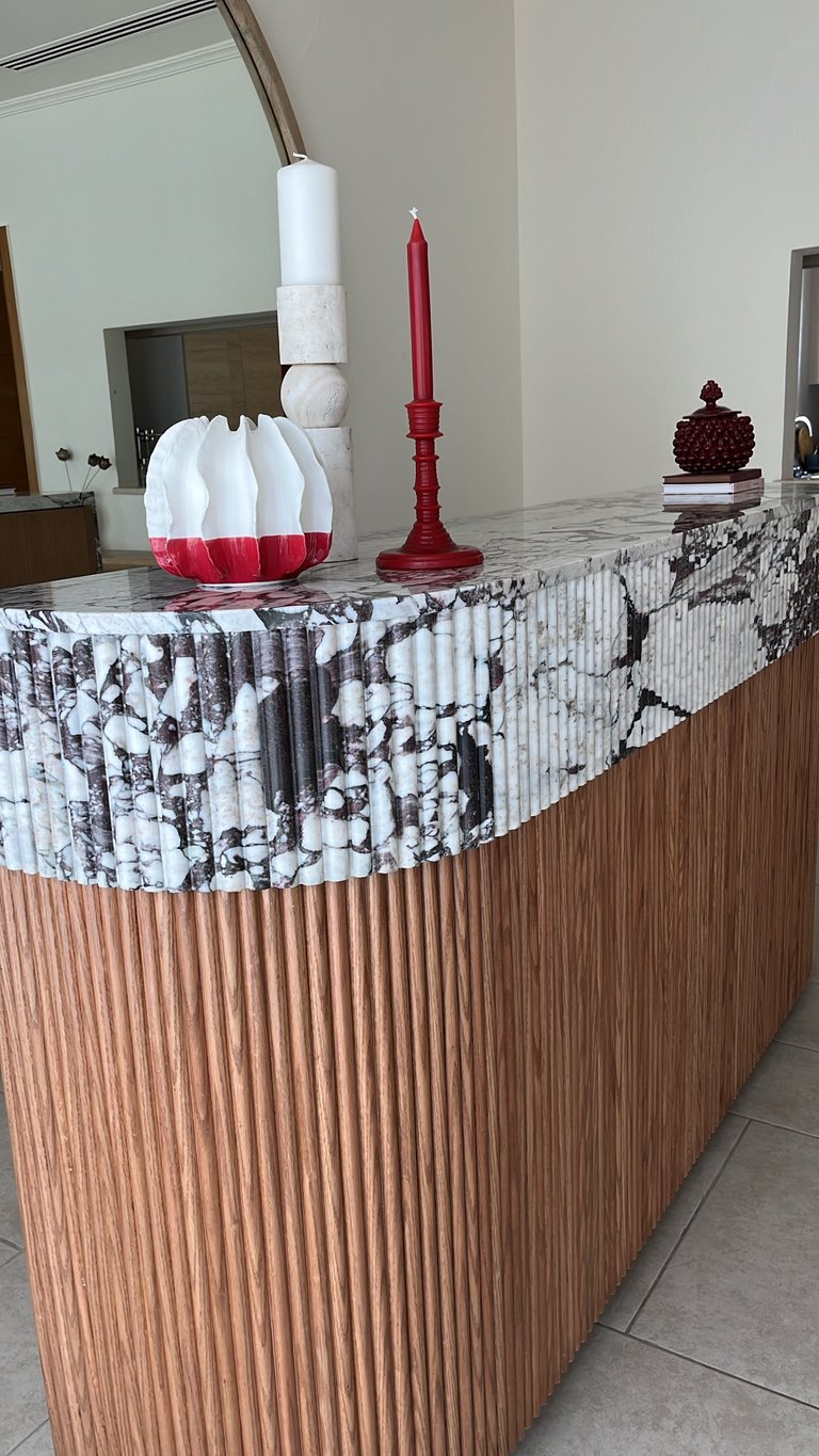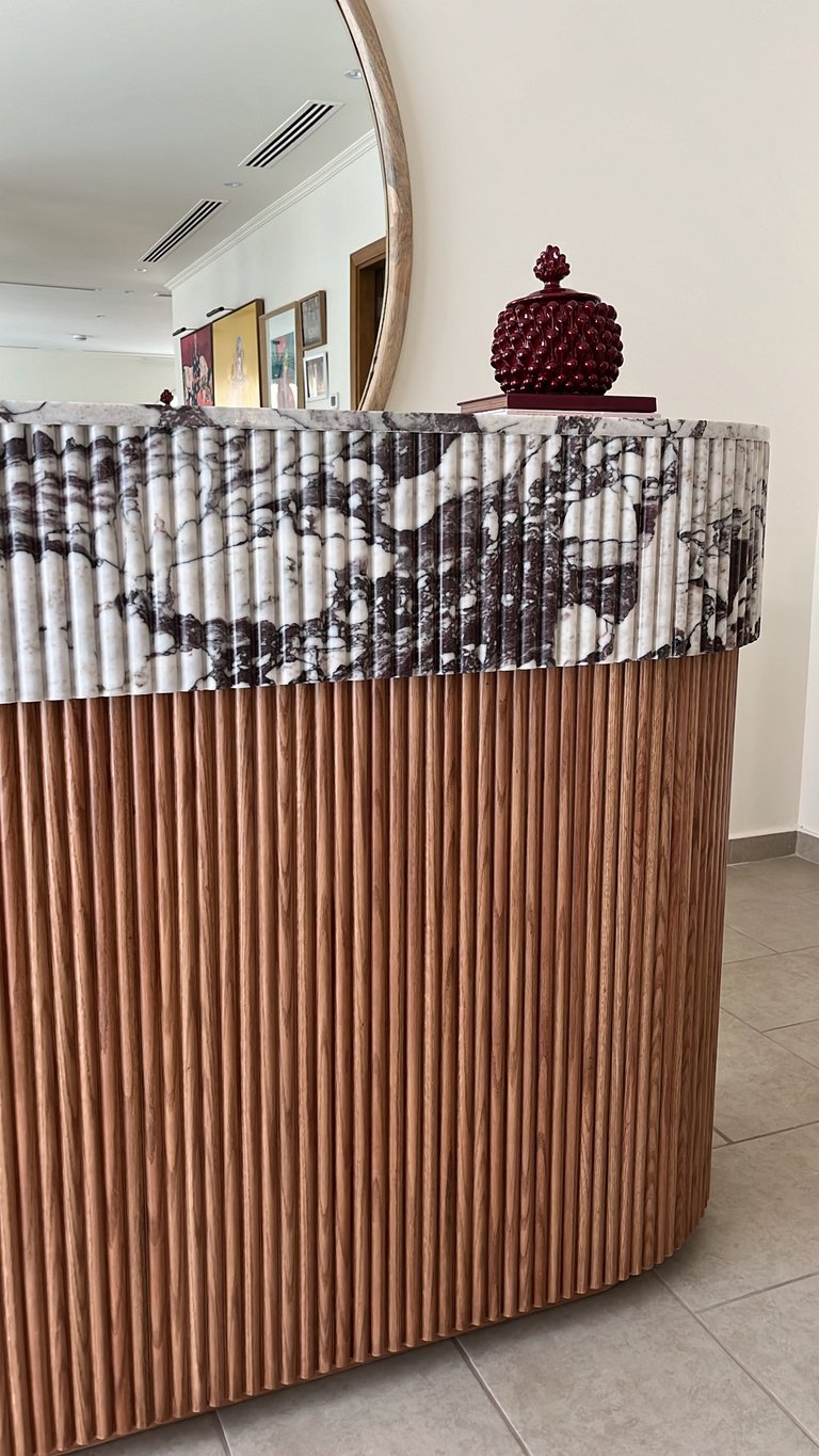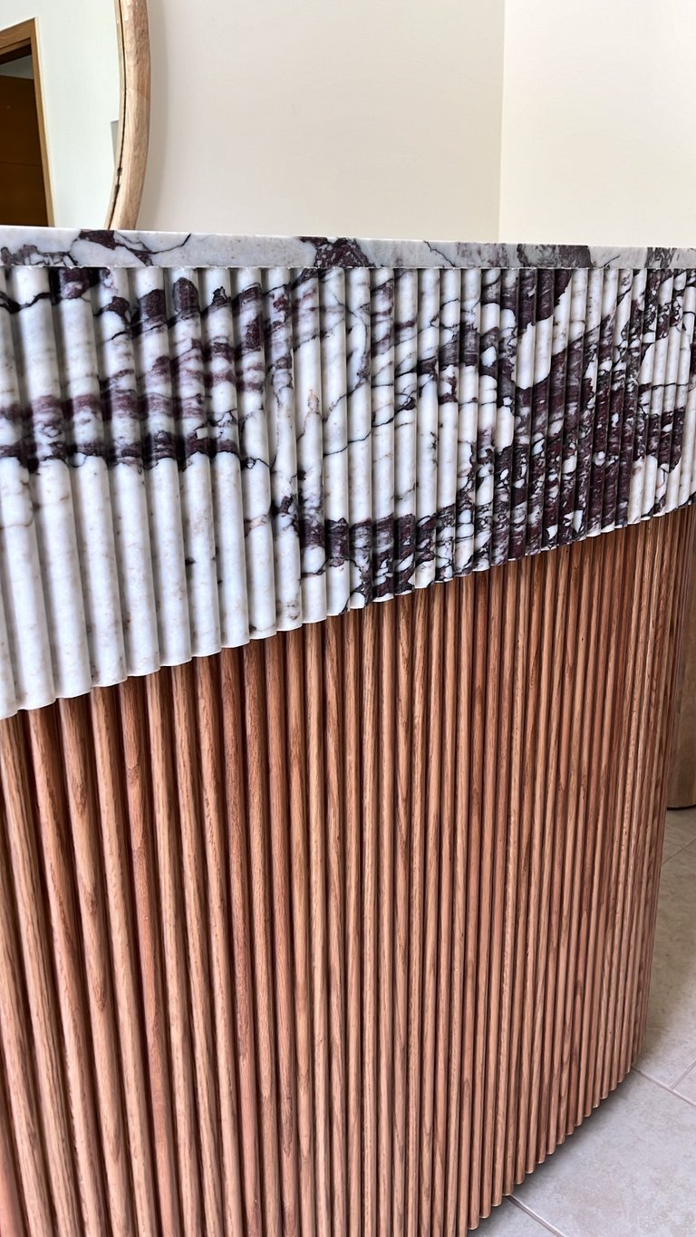 A refined blend of natural warmth and bold luxury, this custom bar pairs fluted wood craftsmanship with a fluted Calacatta Viola marble top, creating a playful and tactile interplay of materials. The rhythm of the fluted surfaces adds depth and movement, making it a striking centerpiece that draws the eye and defines the space. Designed to be both functional and timeless, it is a personal piece that will stay with the owner for years, embodying sophistication, practicality, and enduring character.