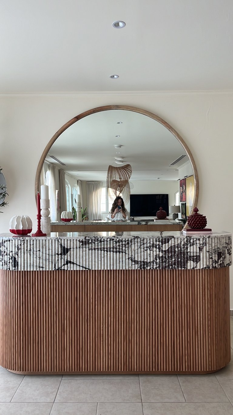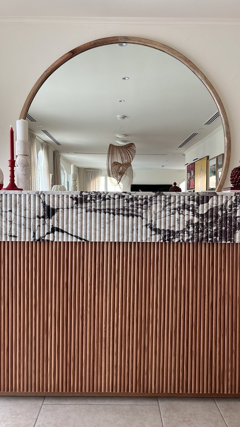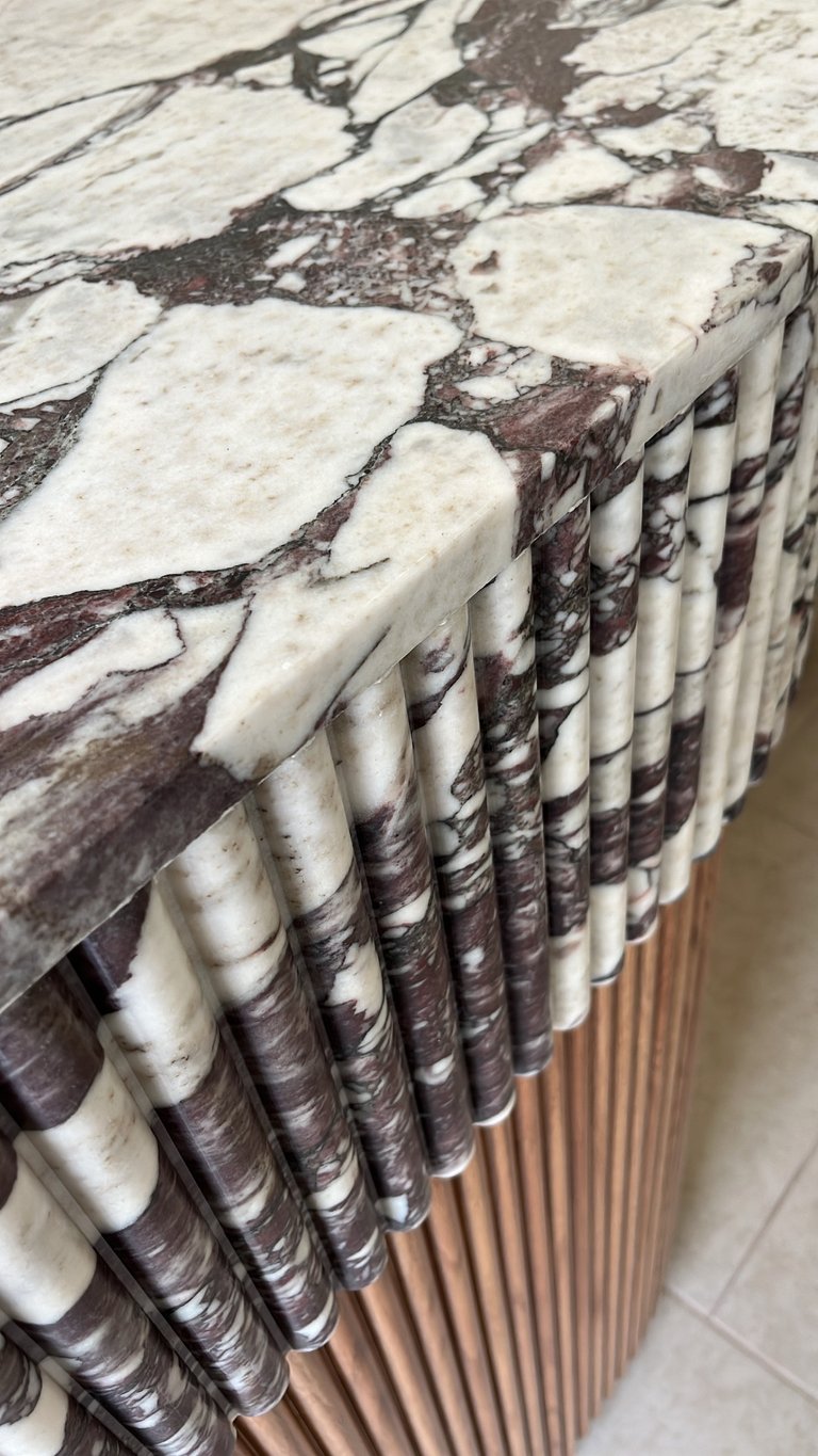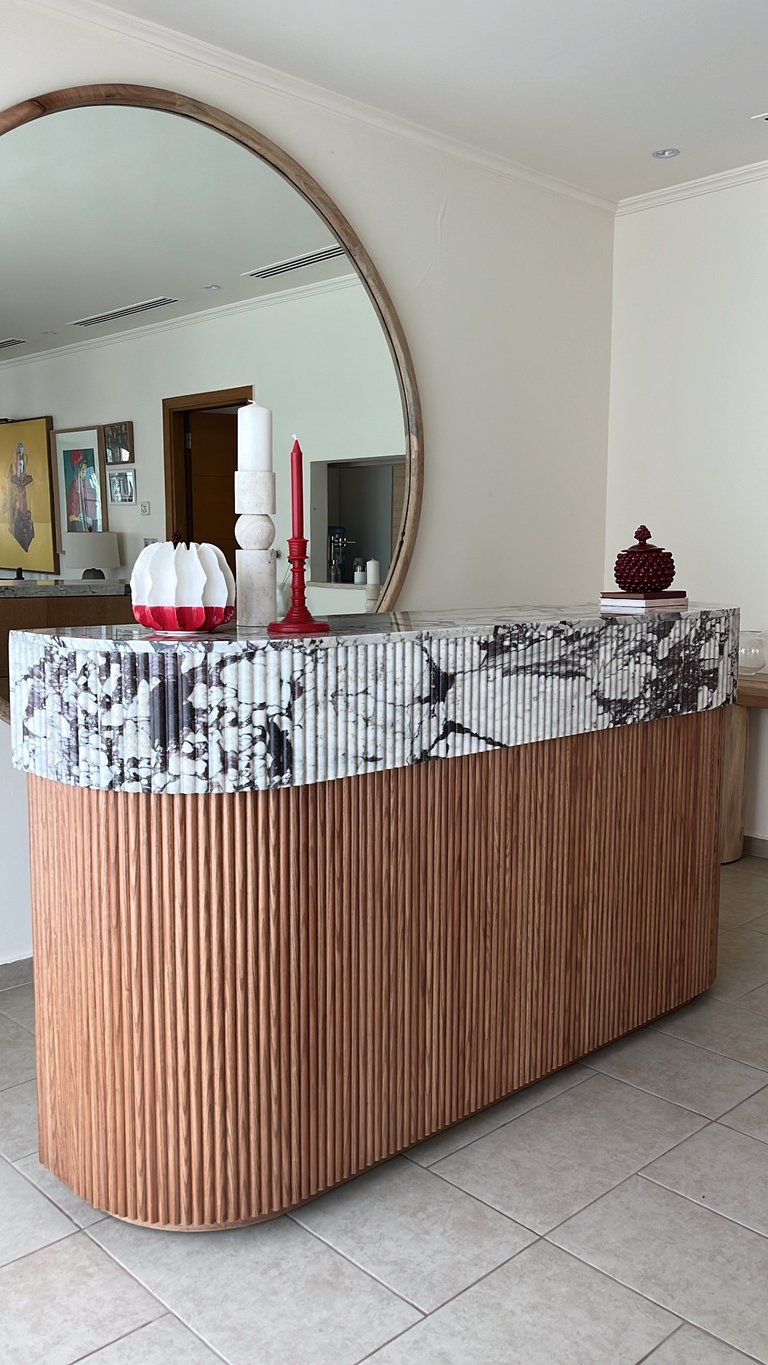A refined blend of natural warmth and bold luxury, this custom bar pairs fluted wood craftsmanship with a fluted Calacatta Viola marble top, creating a playful and tactile interplay of materials. The rhythm of the fluted surfaces adds depth and movement, making it a striking centerpiece that draws the eye and defines the space. Designed to be both functional and timeless, it is a personal piece that will stay with the owner for years, embodying sophistication, practicality, and enduring character.