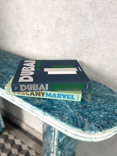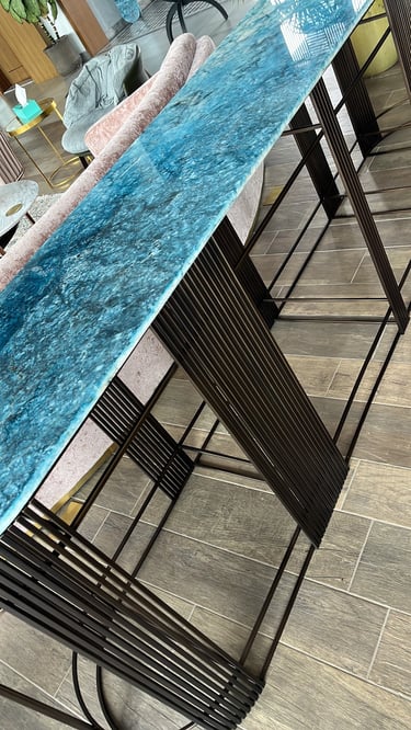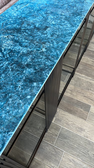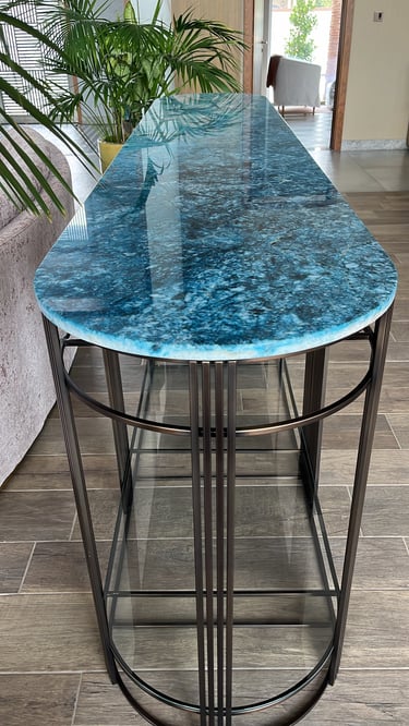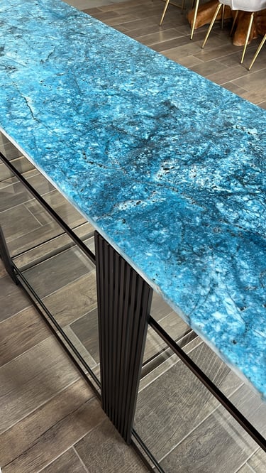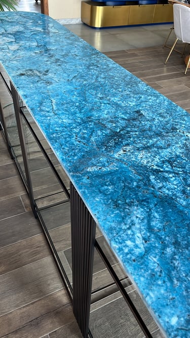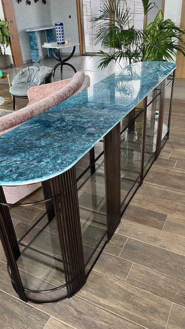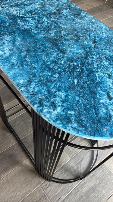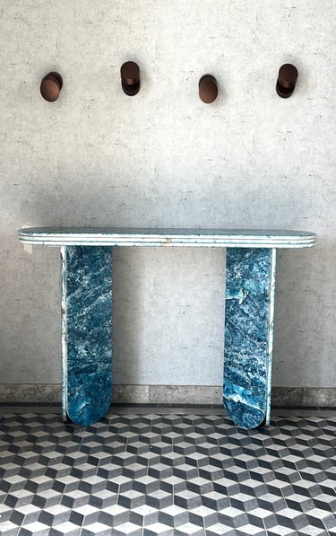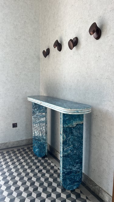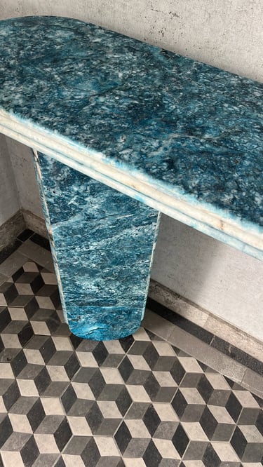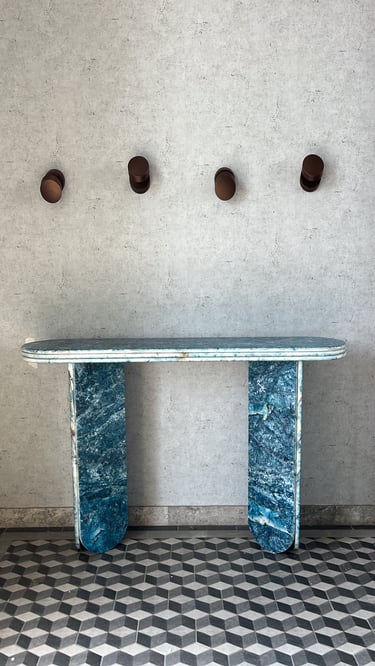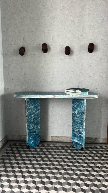 This bespoke entrance console is conceived as a sculptural duo—two complementary pieces placed face to face to anchor a grand entryway with elegance and fluidity. Each piece is crafted from exquisite Brazilian blue marble, selected for its striking turquoise tones that echo the vibrant depths of the ocean. The surfaces shimmer with natural veining, while the consoles rest lightly on sculptural legs shaped like gentle waves, creating the illusion of floating.