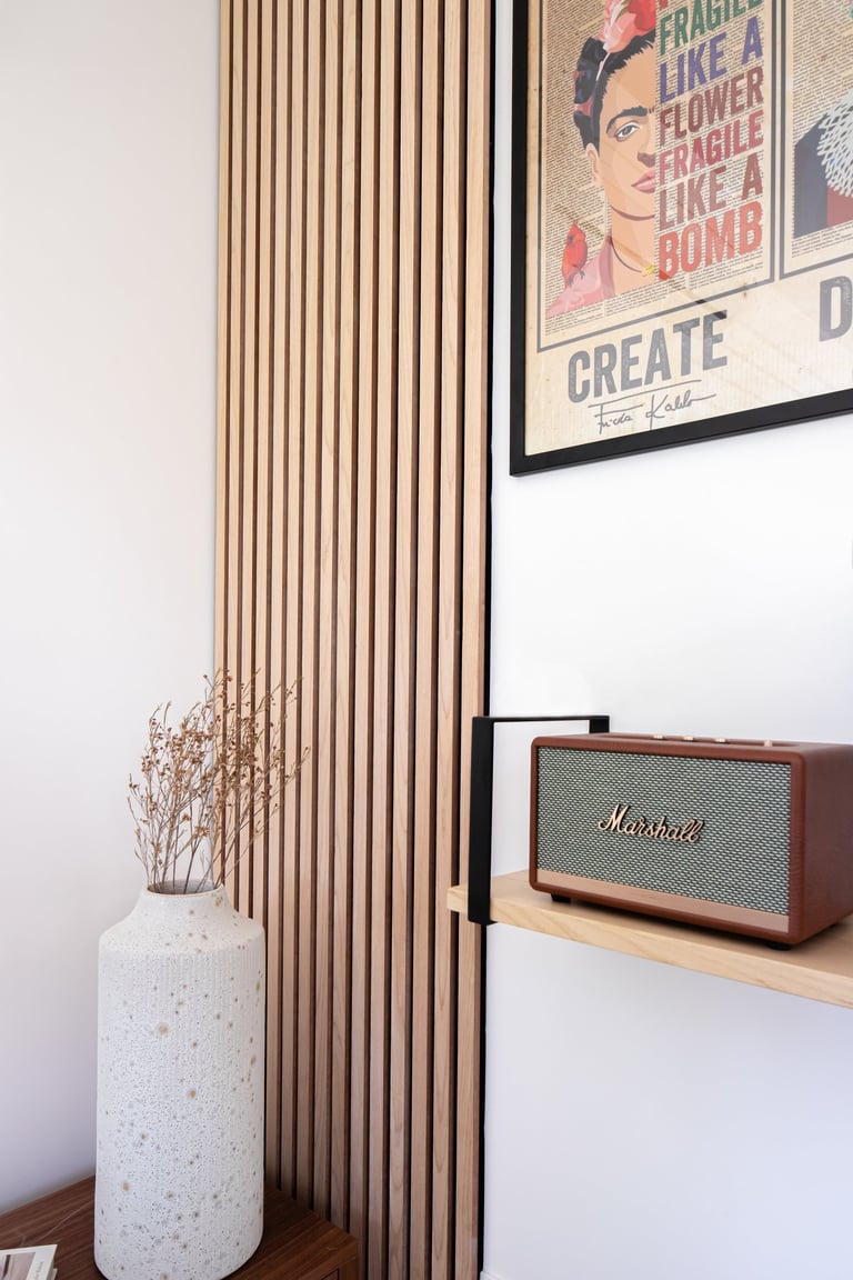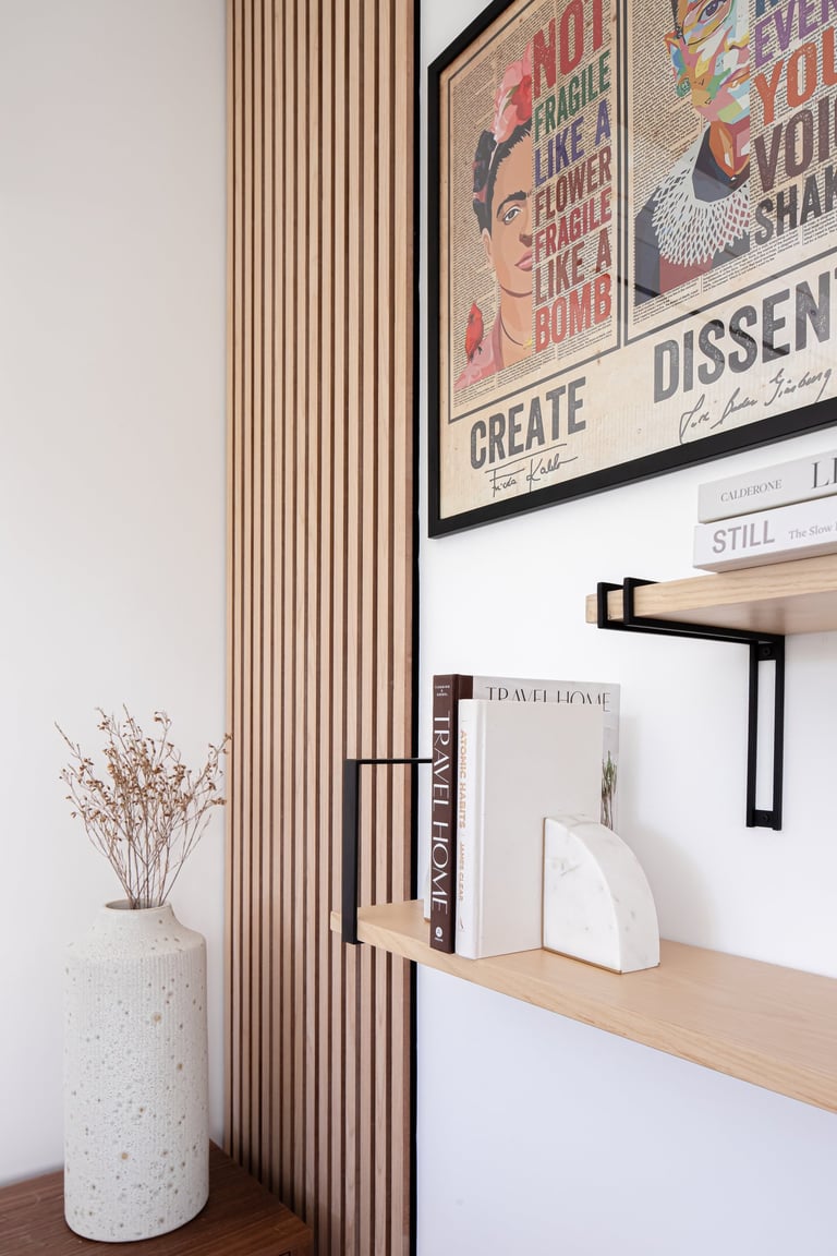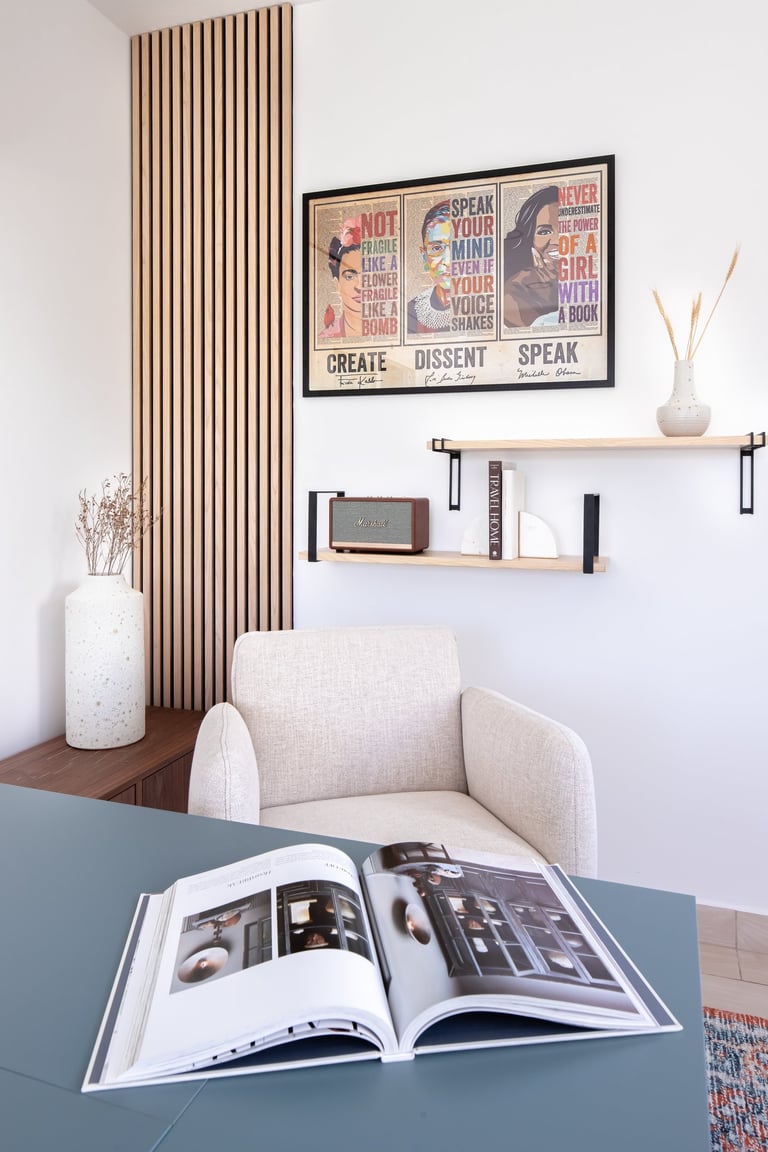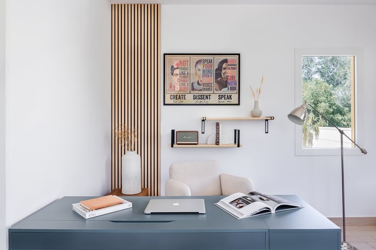 A home office designed to look sharp both on and off screen, balancing functionality with style. Vertical oak slats and clean, precise lines create a confident, structured backdrop, while muted tones keep the space calm and composed. Carefully curated artworks and decorative accents introduce subtle personality and visual interest, enhancing the atmosphere without overwhelming it. Every element, from the streamlined desk to the thoughtful storage solutions, is crafted to support productivity while maintaining a sense of elegance. The result is a workspace that feels both professional and inviting, where form and function coexist in perfect harmony.