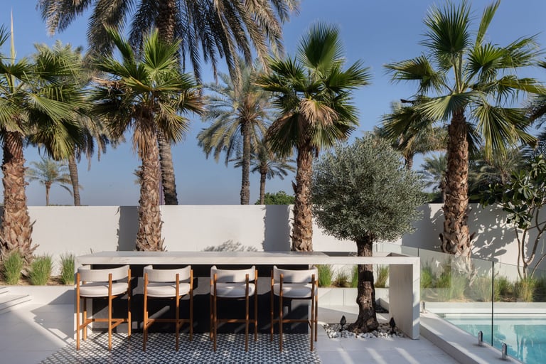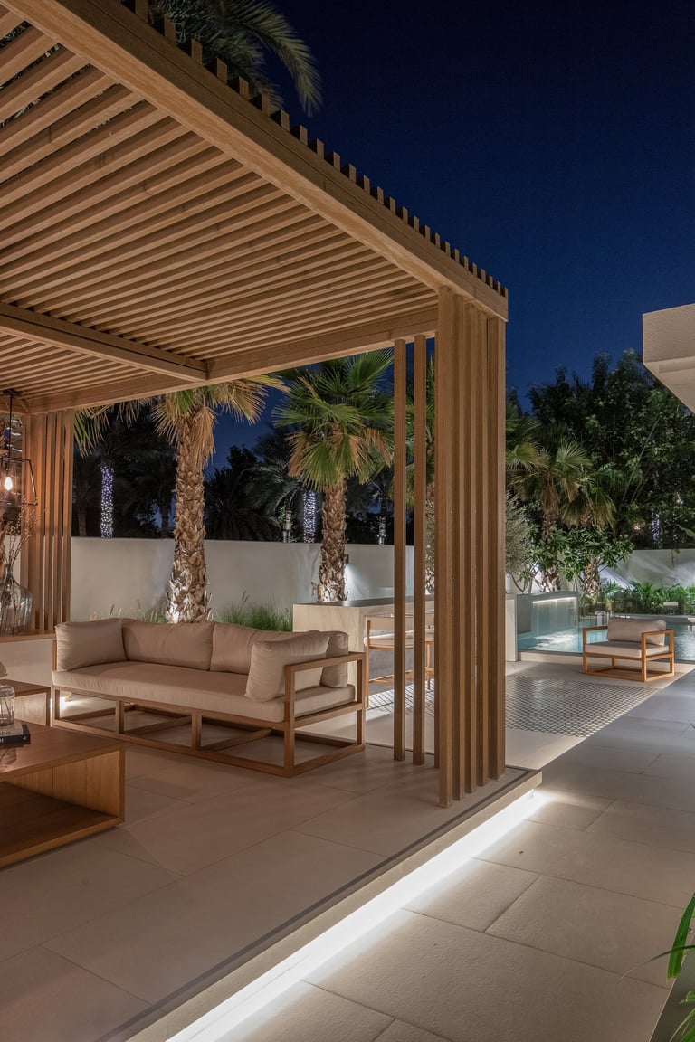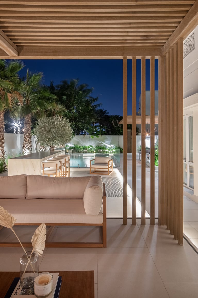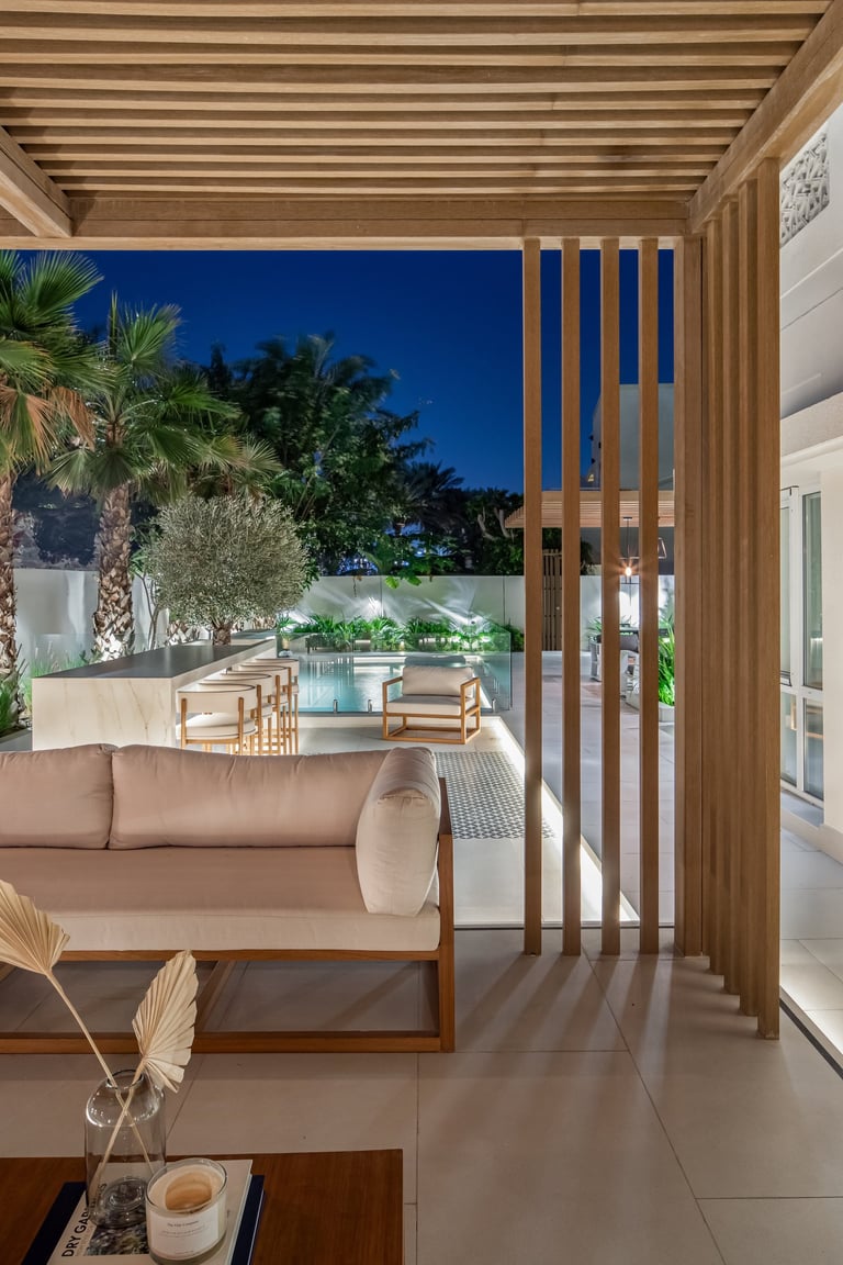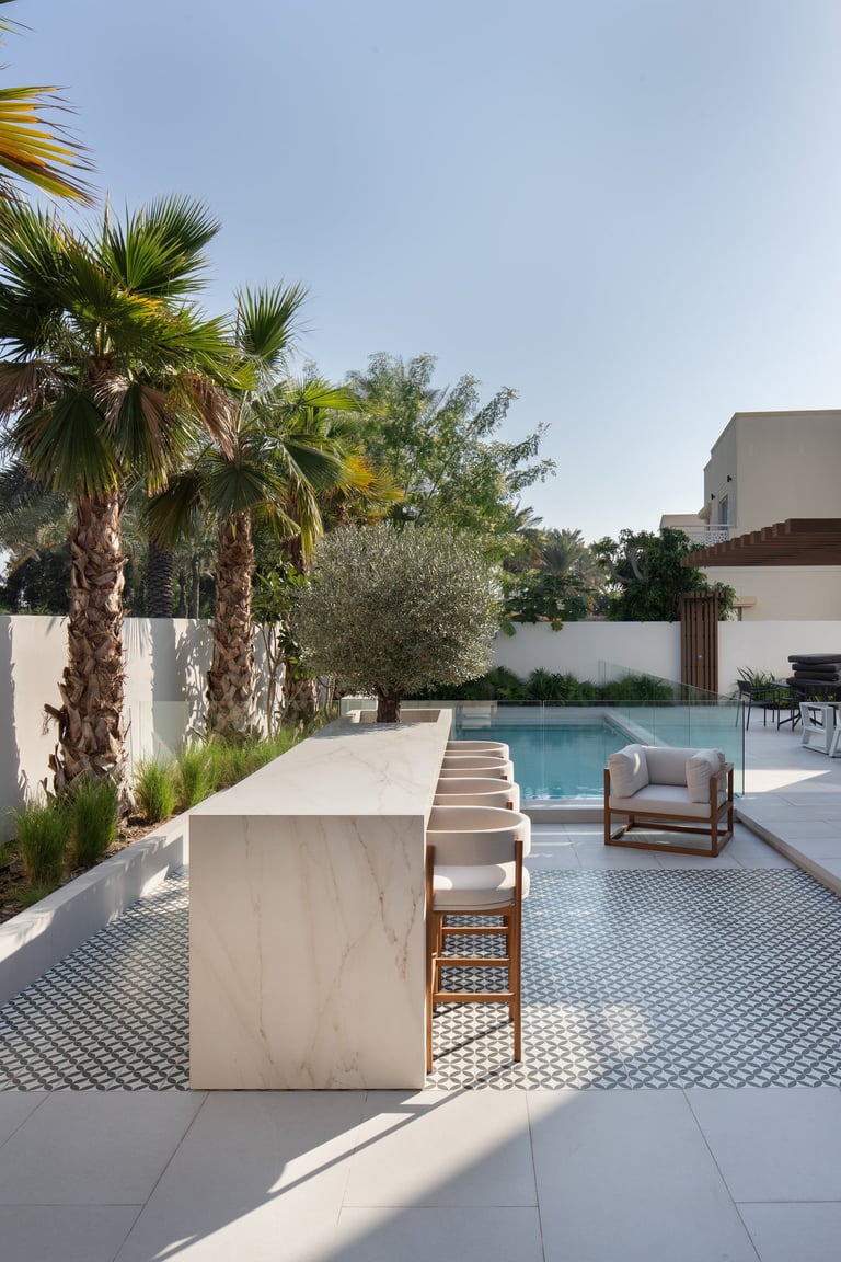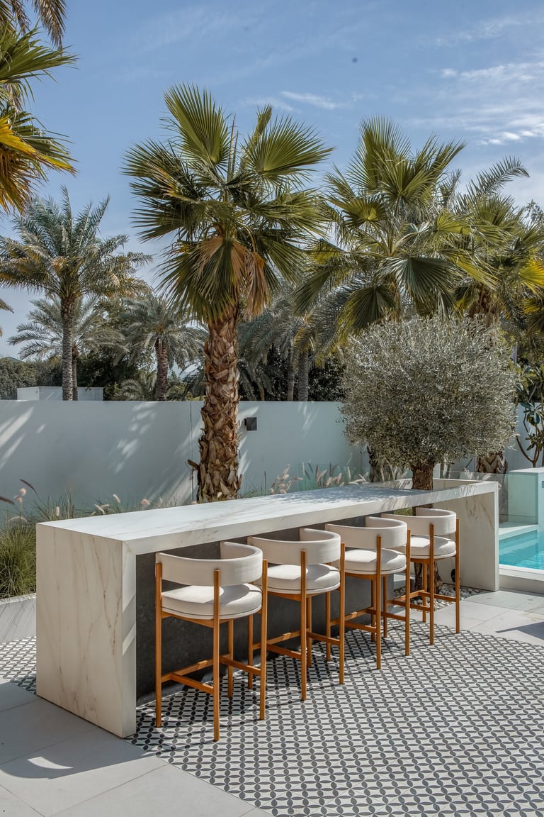 This outdoor space blurs the lines between inside and out, bringing the comfort of the interior into a breezy garden setting. Pale stone floors, custom furniture, and a slatted wood pergola set the stage for laid-back living, with shifting shadows adding character, texture, and depth throughout the day. The bar’s floor introduces a playful touch, contrasting subtly with the rest of the space. Lush greenery and trees chosen to love the Dubai sun bring life and softness to the clean design.