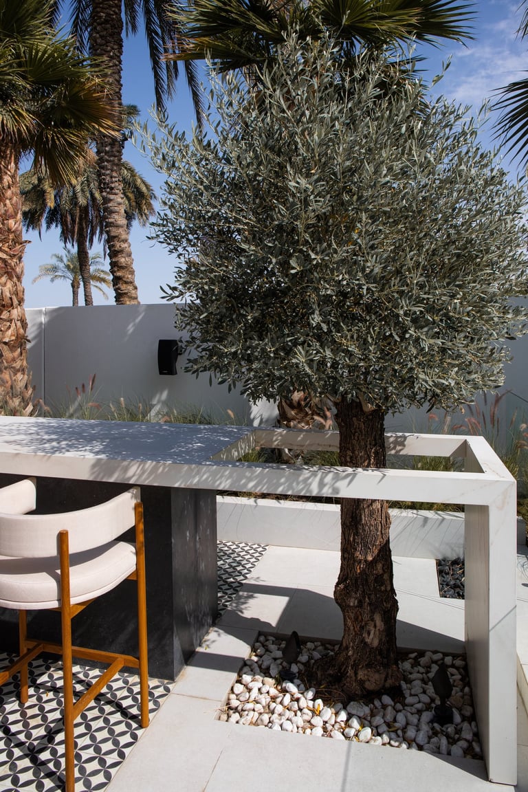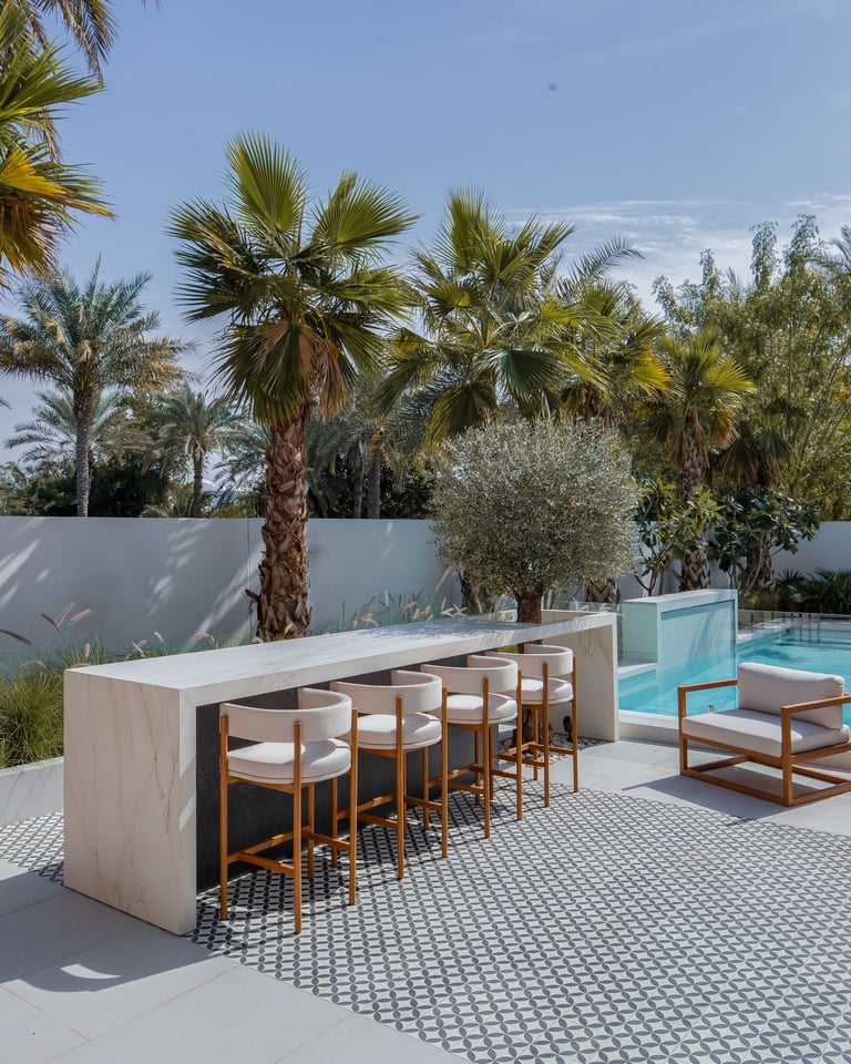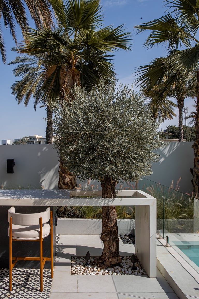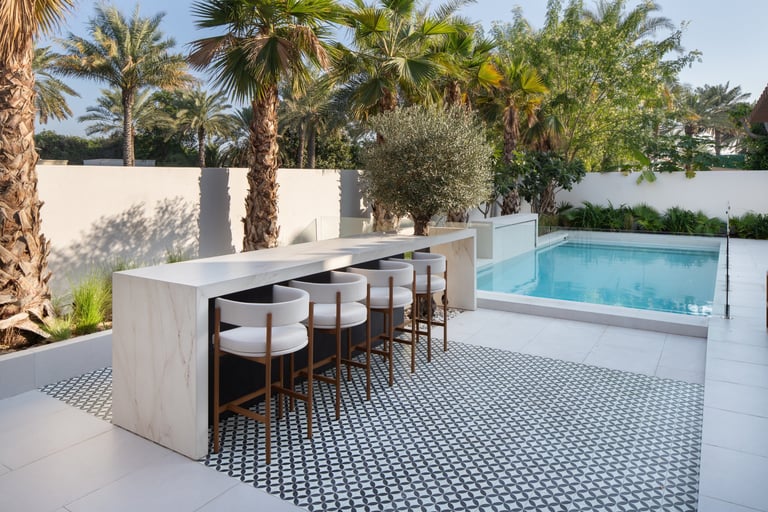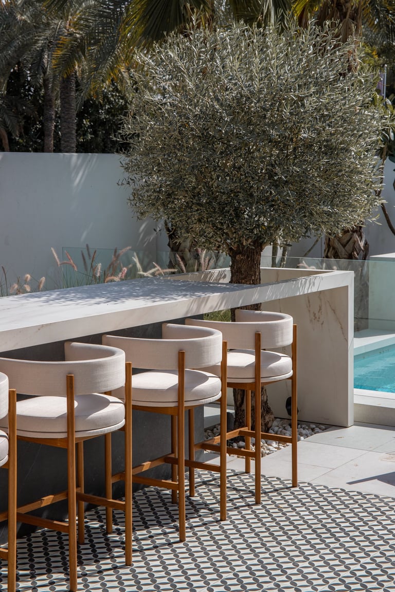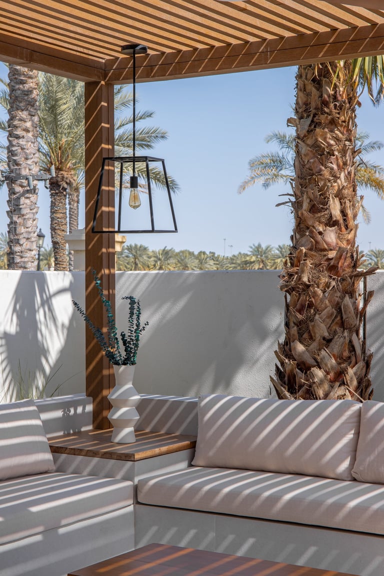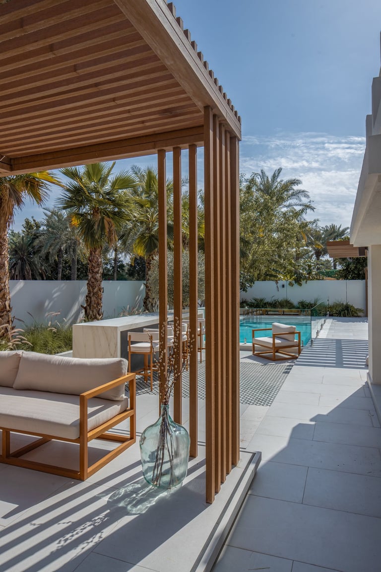 This outdoor space blurs the lines between inside and out, bringing the comfort of the interior into a breezy garden setting. Pale stone floors, custom furniture, and a slatted wood pergola set the stage for laid-back living, with shifting shadows adding character, texture, and depth throughout the day. The bar’s floor introduces a playful touch, contrasting subtly with the rest of the space. Lush greenery and trees chosen to love the Dubai sun bring life and softness to the clean design.