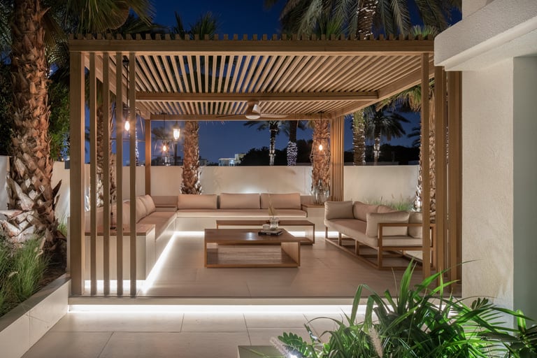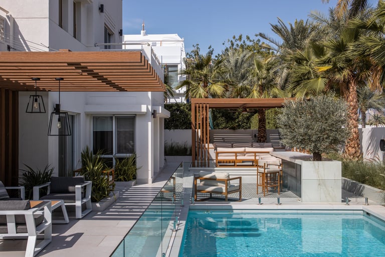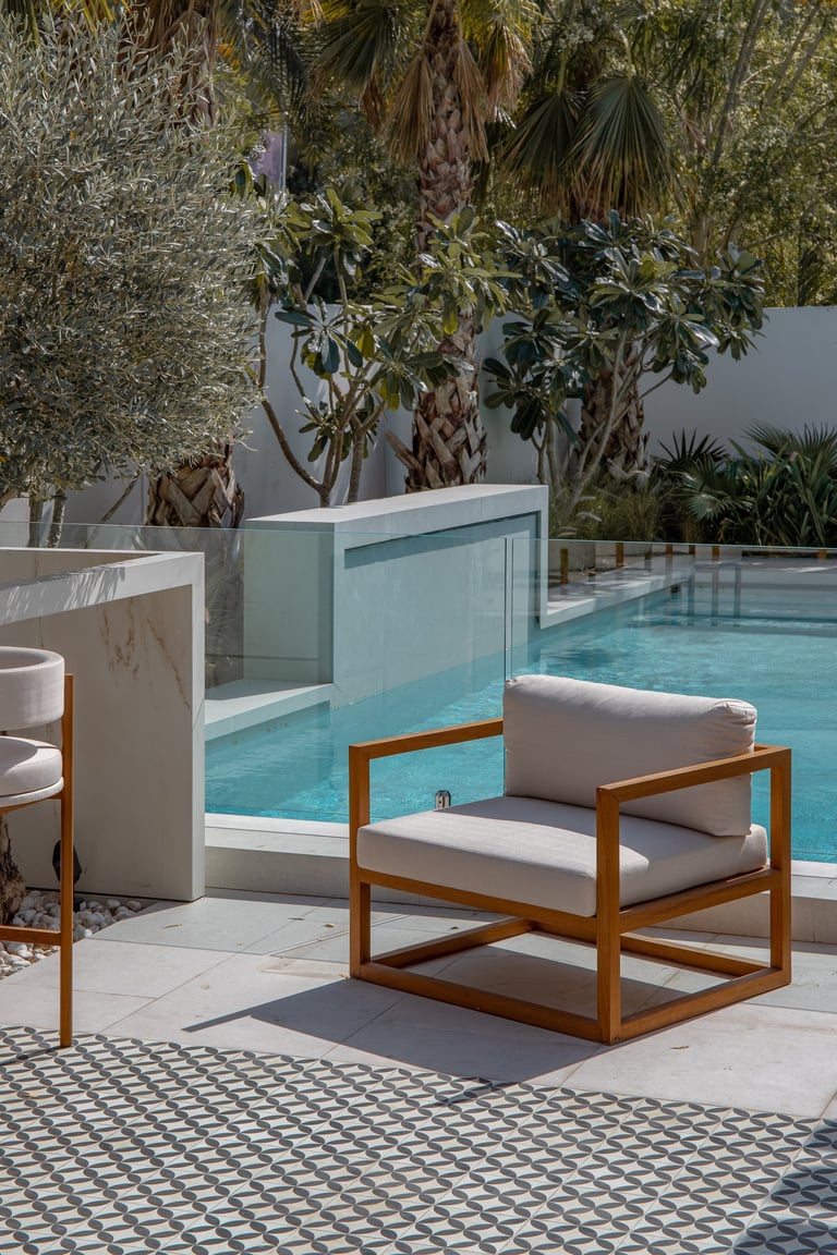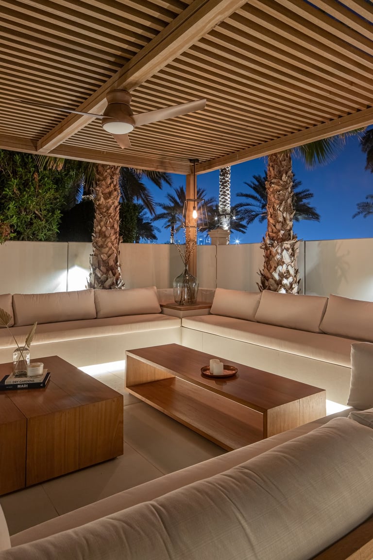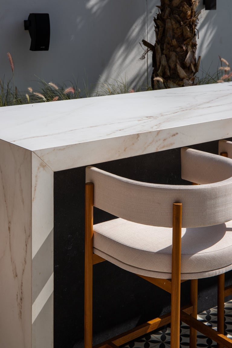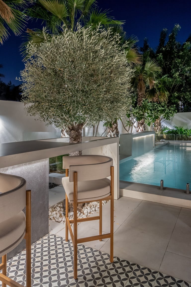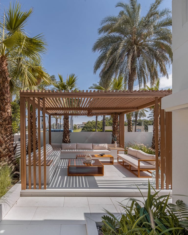 This outdoor space blurs the lines between inside and out, bringing the comfort of the interior into a breezy garden setting. Pale stone floors, custom furniture, and a slatted wood pergola set the stage for laid-back living, with shifting shadows adding character, texture, and depth throughout the day. The bar’s floor introduces a playful touch, contrasting subtly with the rest of the space. Lush greenery and trees chosen to love the Dubai sun bring life and softness to the clean design.