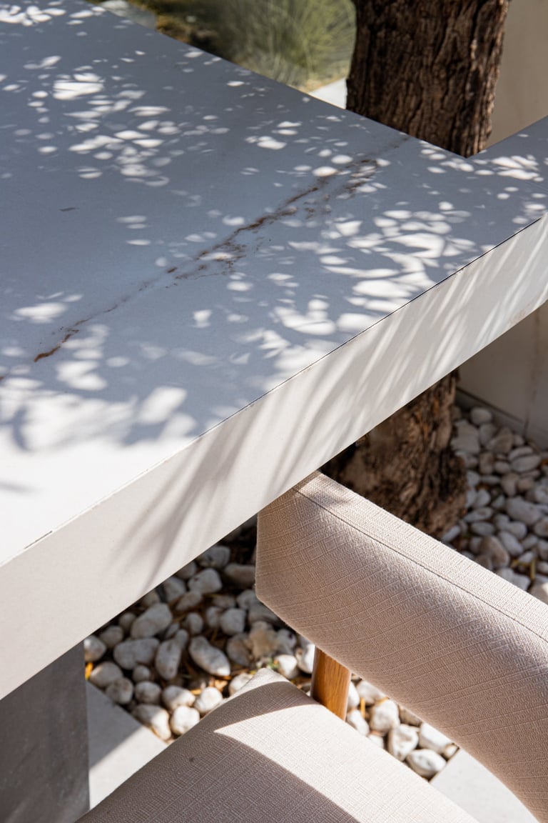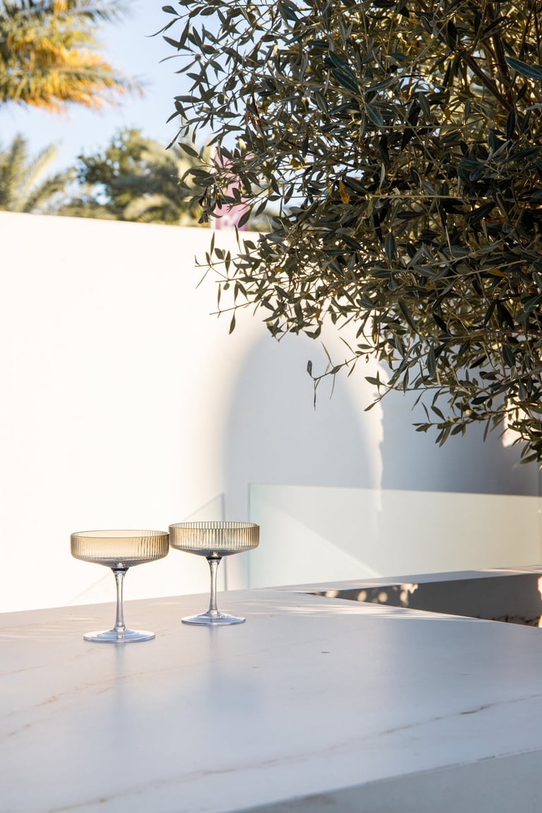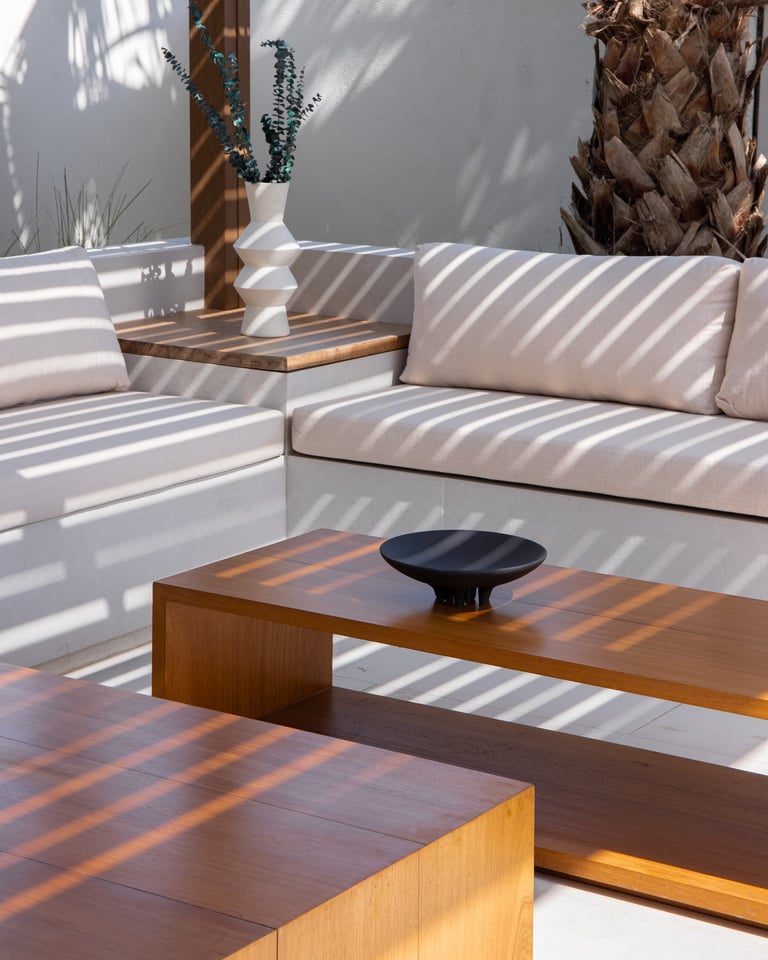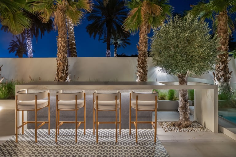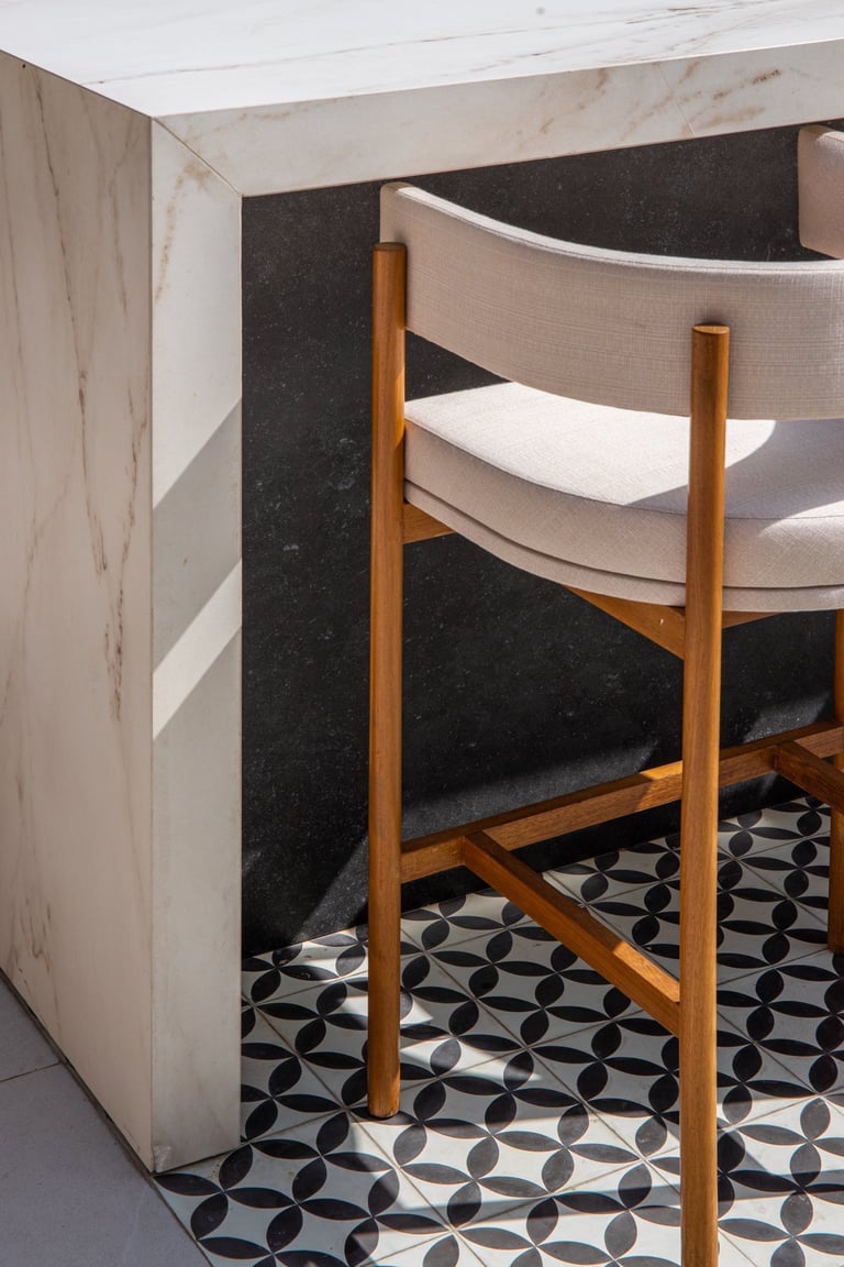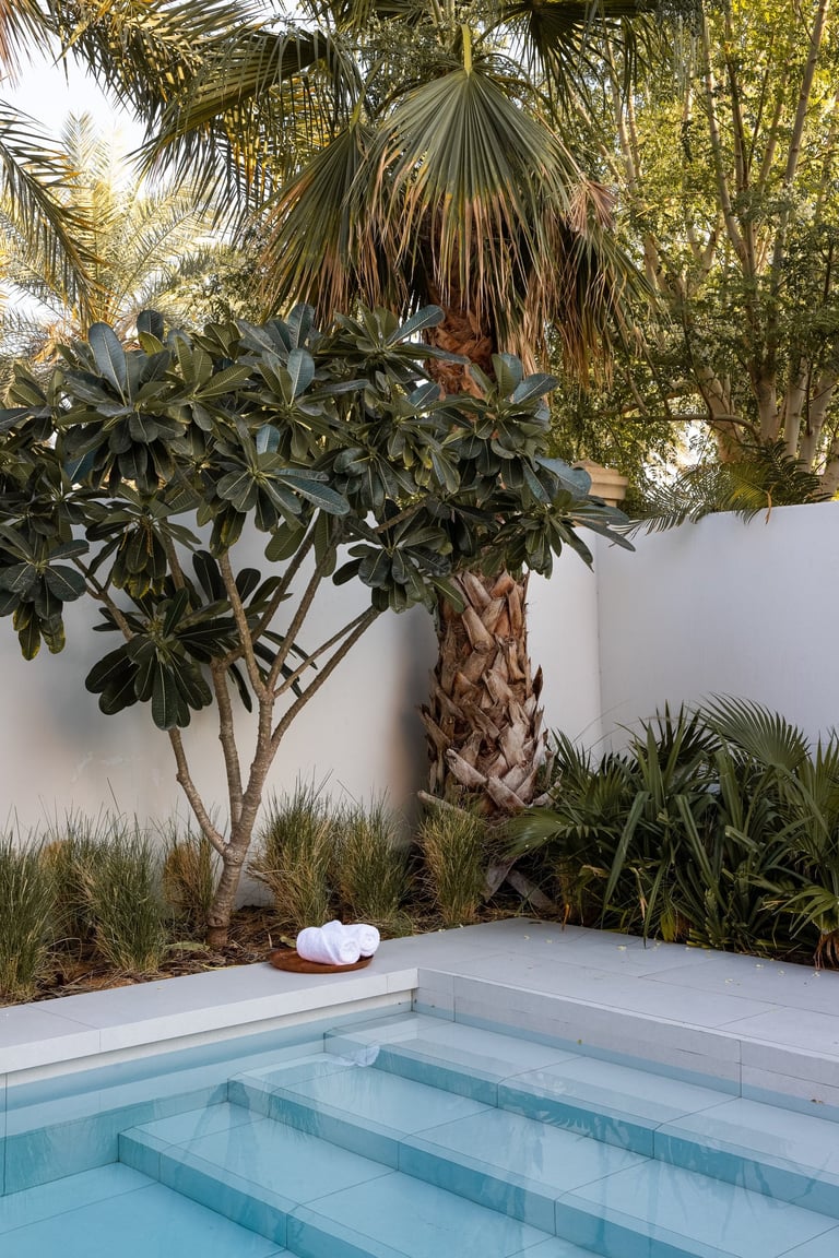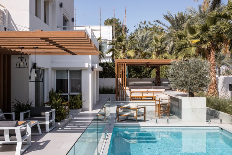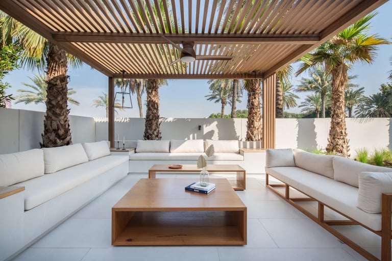 This outdoor space blurs the lines between inside and out, bringing the comfort of the interior into a breezy garden setting. Pale stone floors, custom furniture, and a slatted wood pergola set the stage for laid-back living, with shifting shadows adding character, texture, and depth throughout the day. The bar’s floor introduces a playful touch, contrasting subtly with the rest of the space. Lush greenery and trees chosen to love the Dubai sun bring life and softness to the clean design.