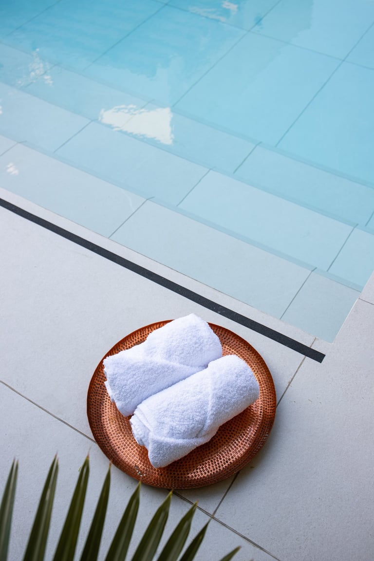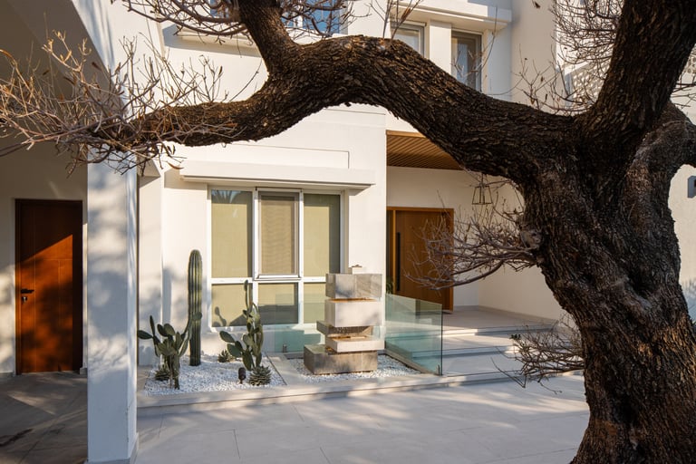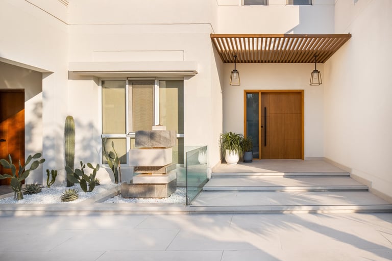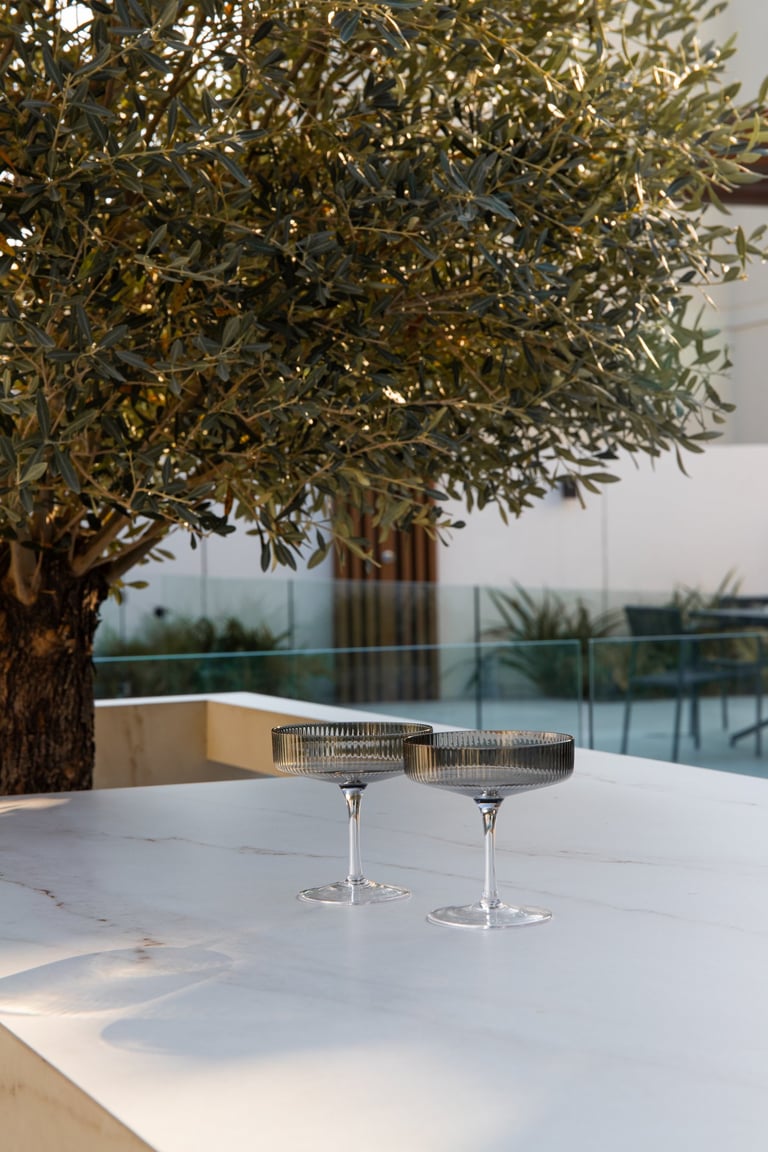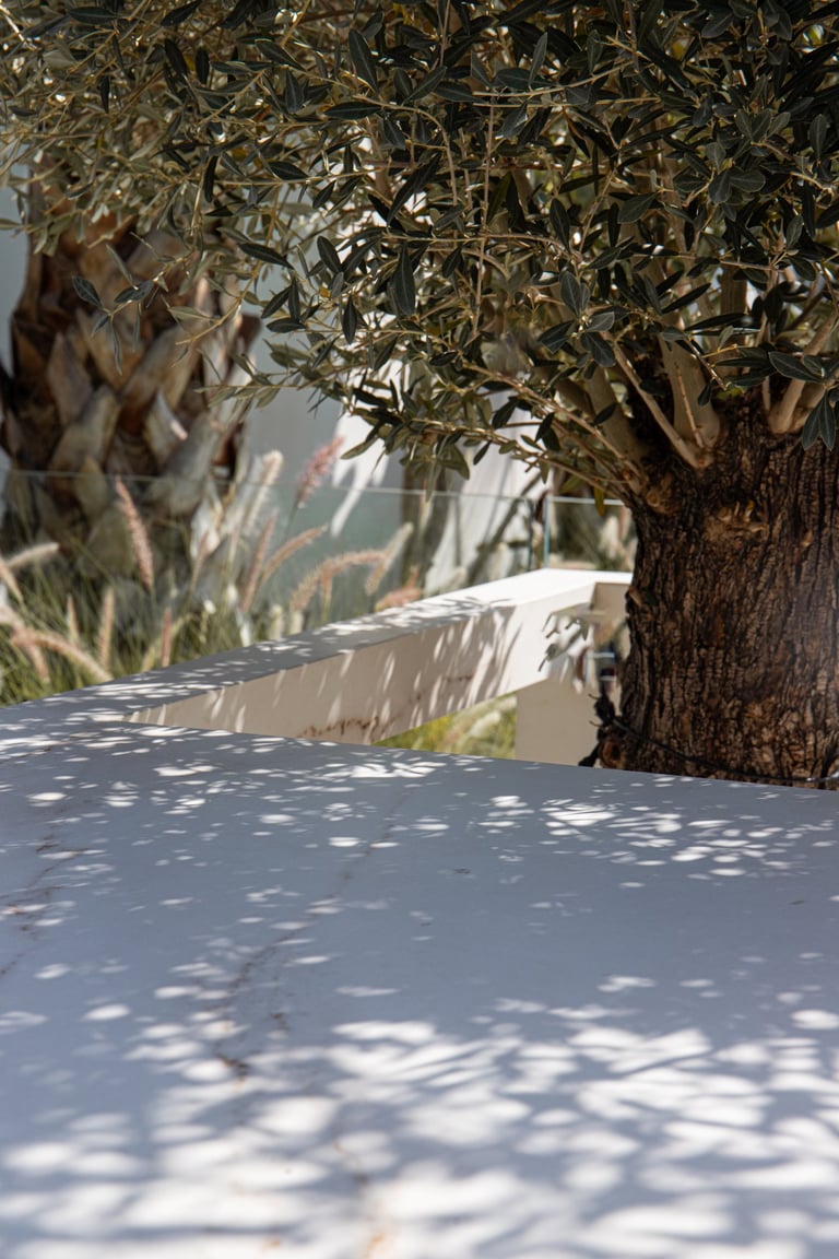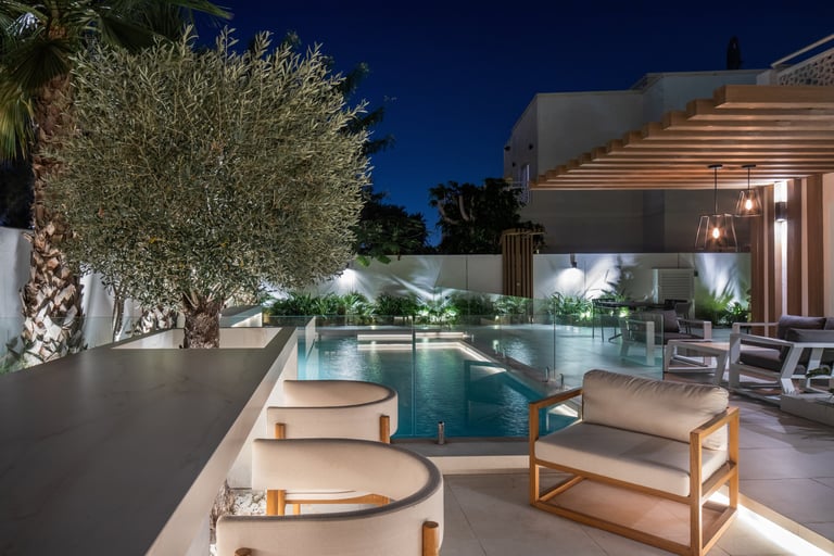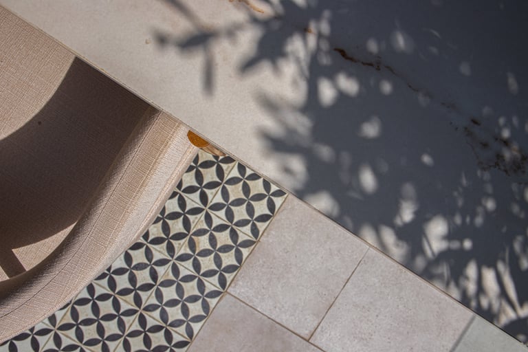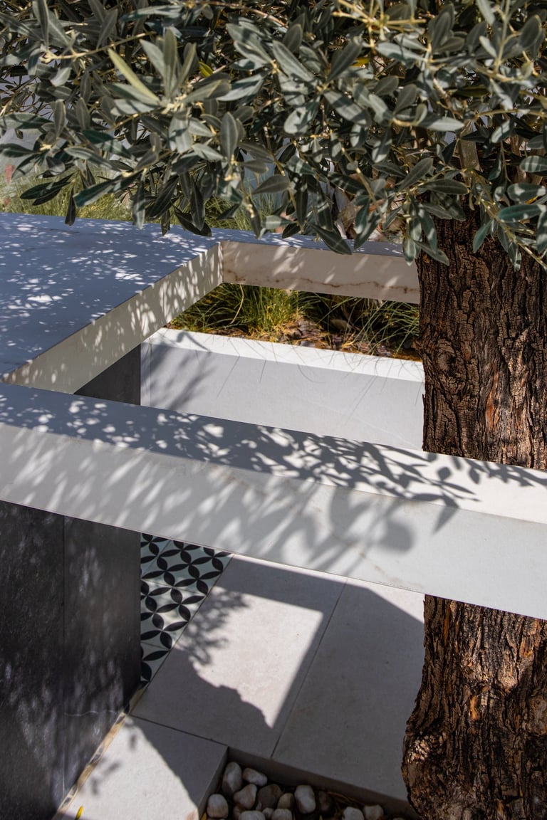 This outdoor space blurs the lines between inside and out, bringing the comfort of the interior into a breezy garden setting. Pale stone floors, custom furniture, and a slatted wood pergola set the stage for laid-back living, with shifting shadows adding character, texture, and depth throughout the day. The bar’s floor introduces a playful touch, contrasting subtly with the rest of the space. Lush greenery and trees chosen to love the Dubai sun bring life and softness to the clean design.
