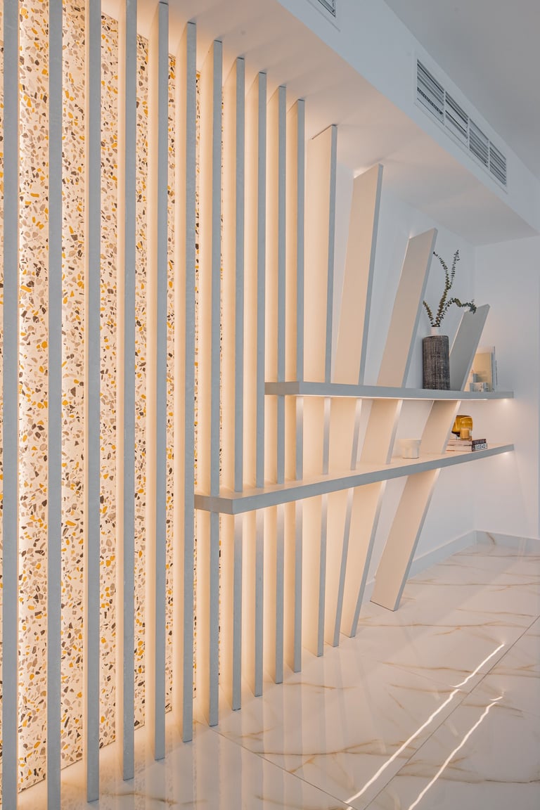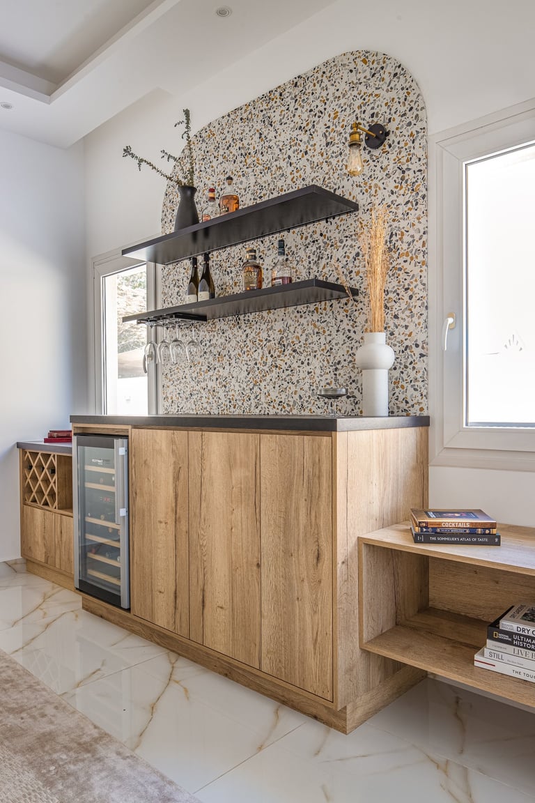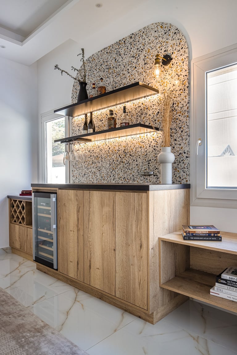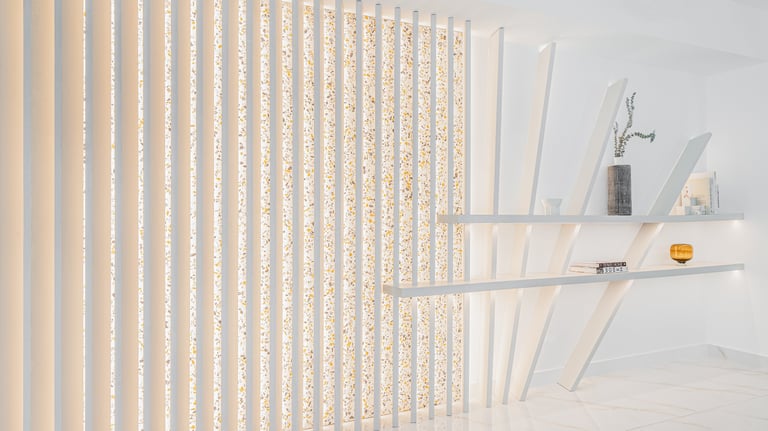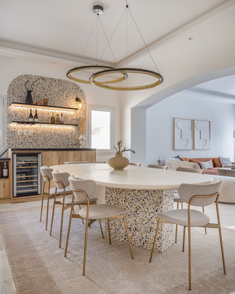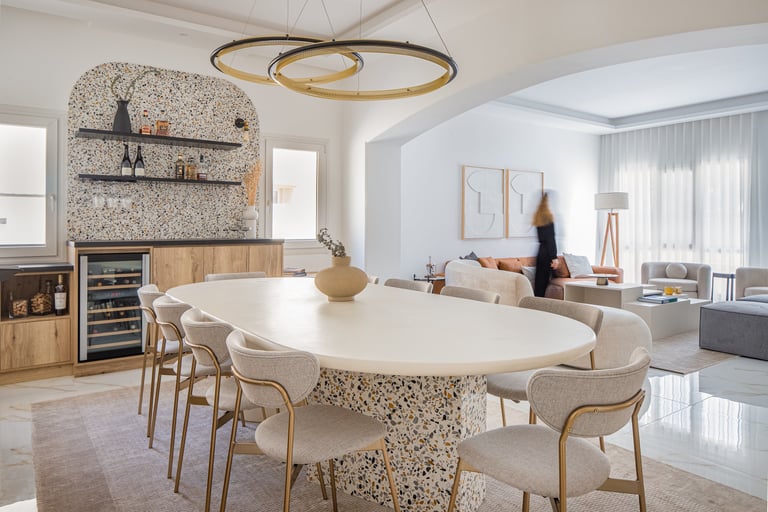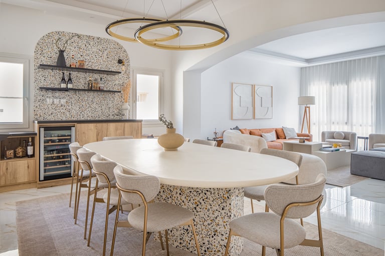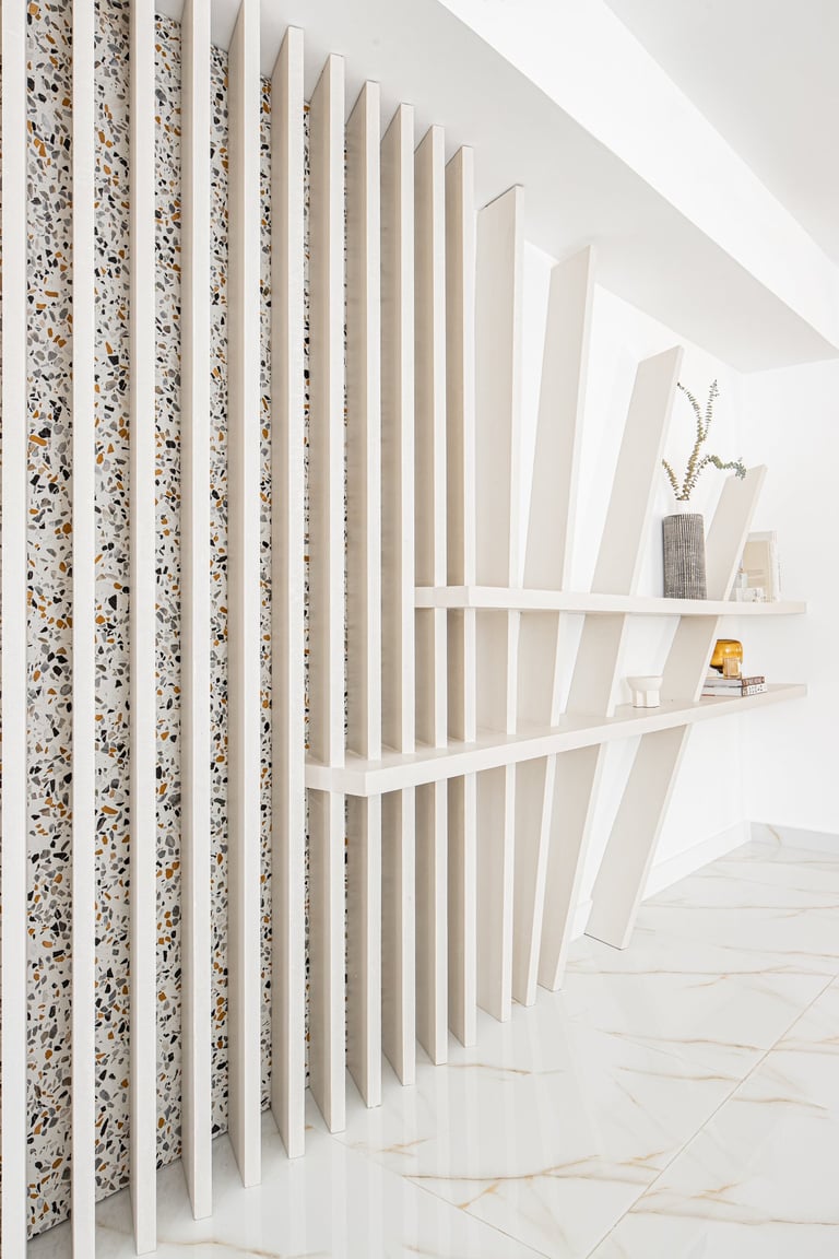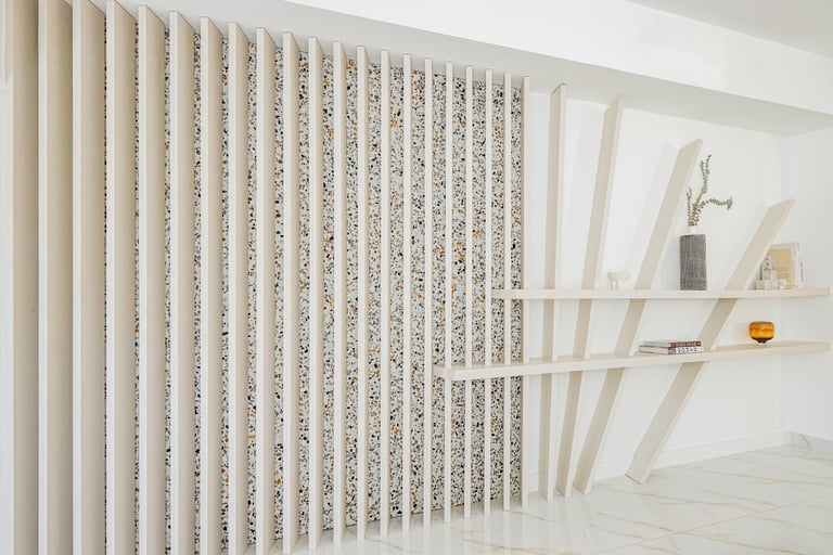 In this contemporary interior, terrazzo and micro-cement become sculptural statements. A falling shelf unit, with slates tilted at 45 degrees, creates a cascading visual effect, serving as both storage and a decorative wall feature. It blends seamlessly with a soft, inviting living area anchored by a large seating arrangement and a modular coffee table, whose sections can double as side tables for function and aesthetic. A bespoke bar with an arched terrazzo backdrop links the space, while warm wood, soft textures, and diffused light balance the dynamic geometry, creating a calm yet visually engaging composition.