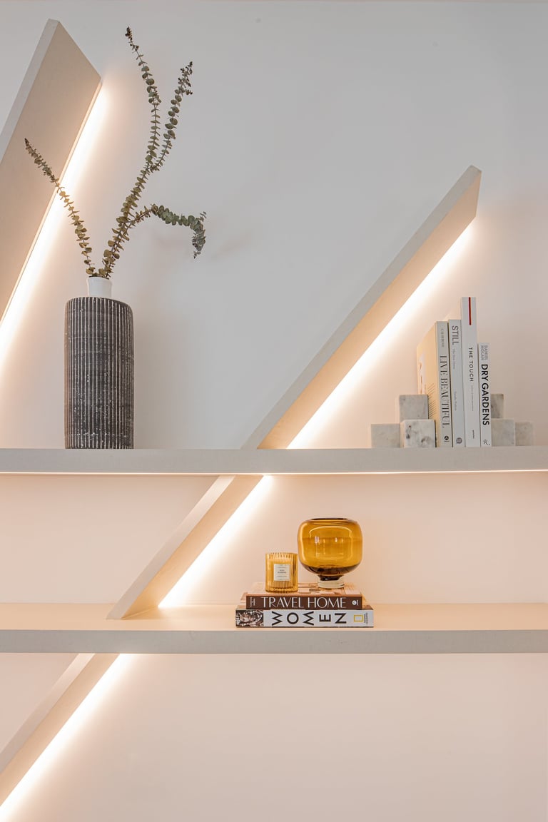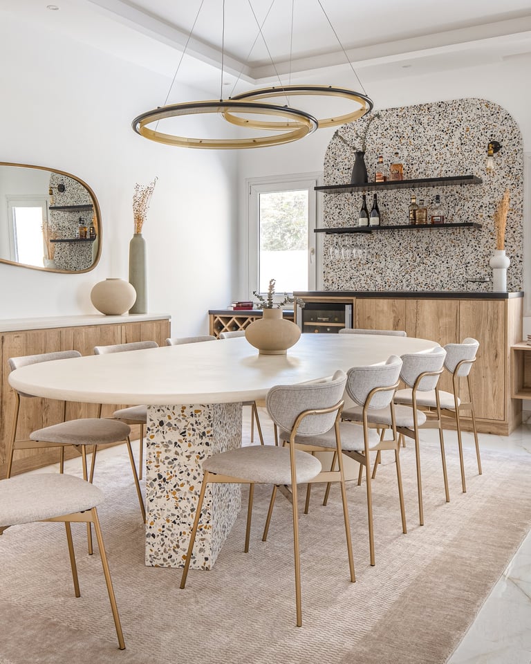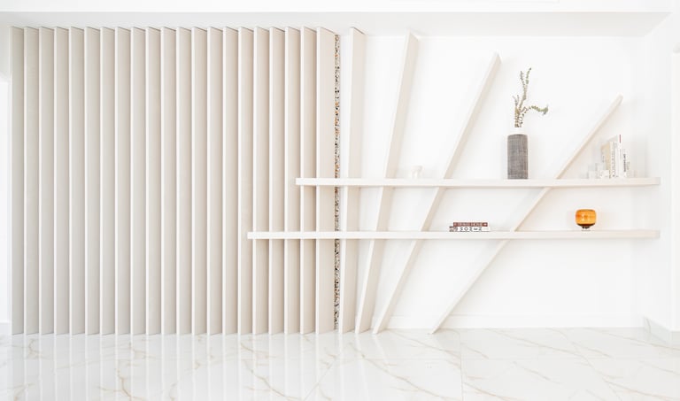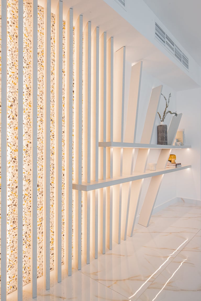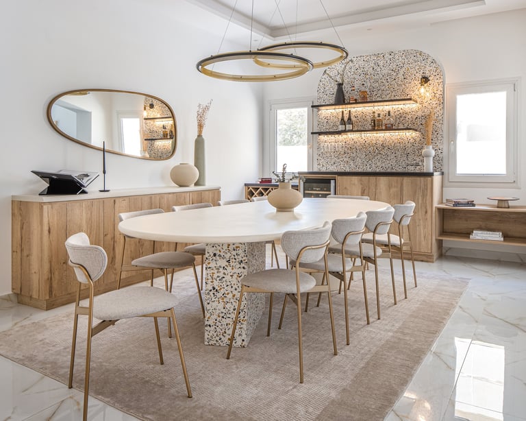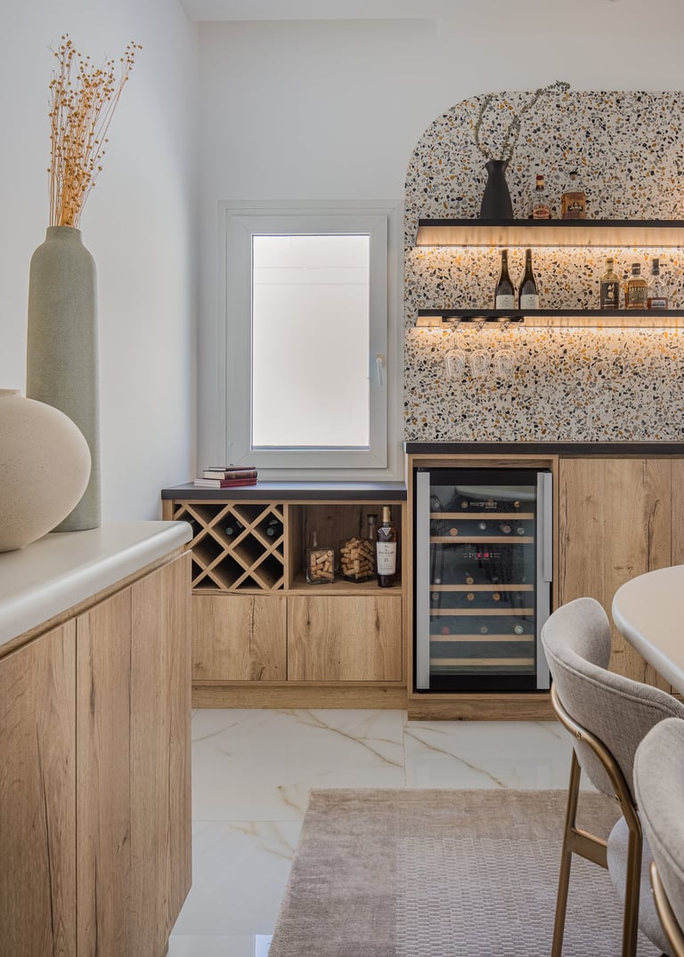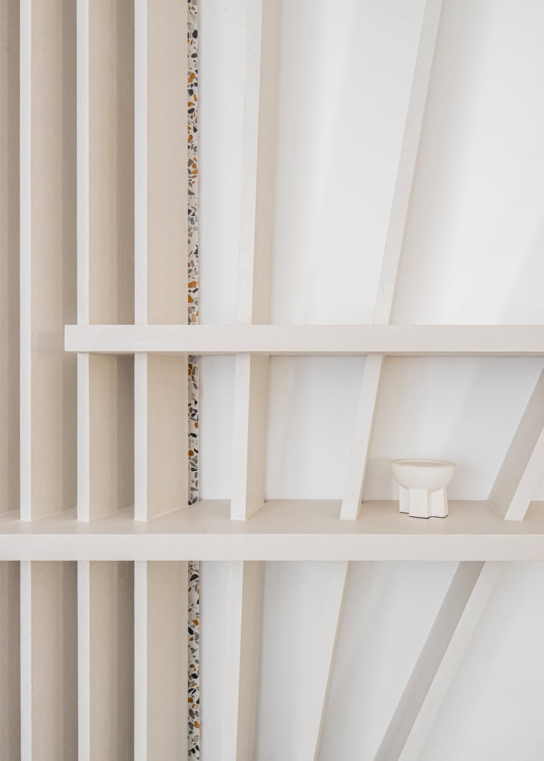 In this contemporary interior, terrazzo and micro-cement become sculptural statements. A falling shelf unit, with slates tilted at 45 degrees, creates a cascading visual effect, serving as both storage and a decorative wall feature. It blends seamlessly with a soft, inviting living area anchored by a large seating arrangement and a modular coffee table, whose sections can double as side tables for function and aesthetic. A bespoke bar with an arched terrazzo backdrop links the space, while warm wood, soft textures, and diffused light balance the dynamic geometry, creating a calm yet visually engaging composition.