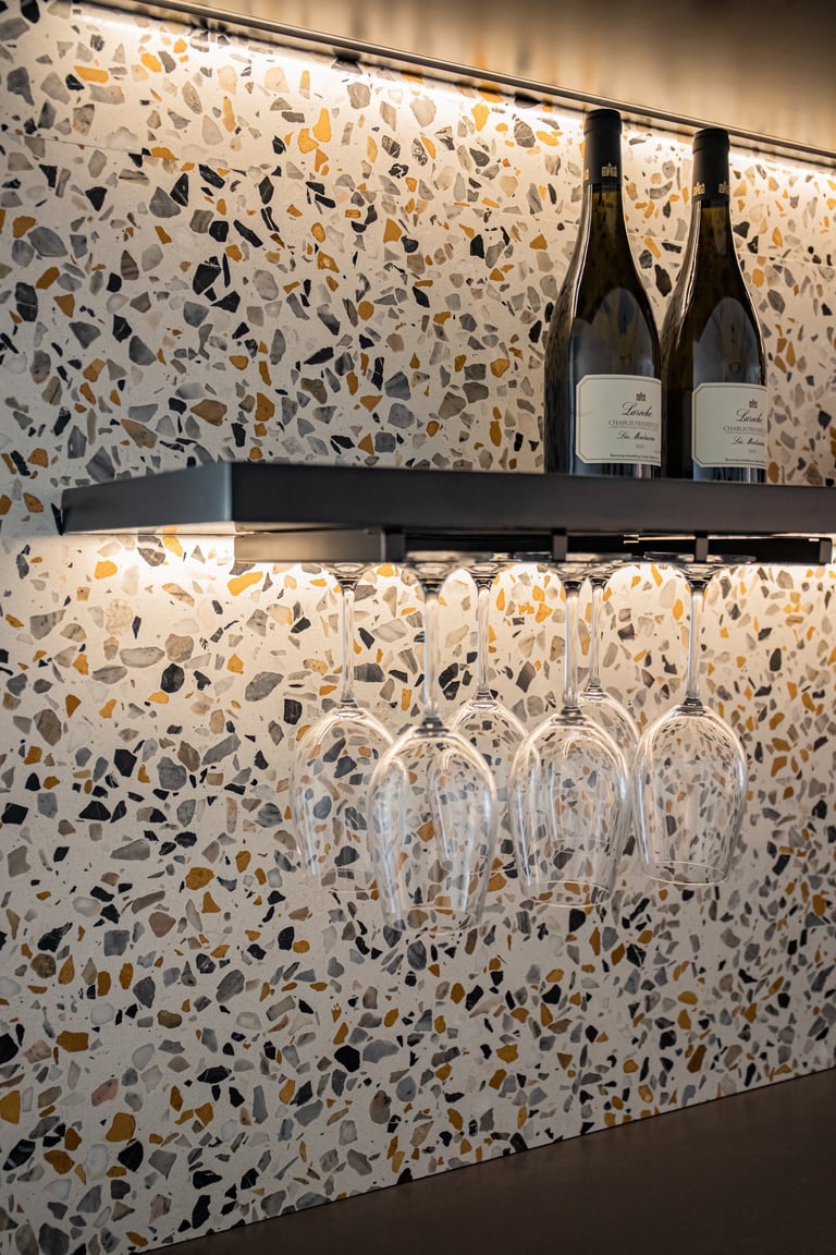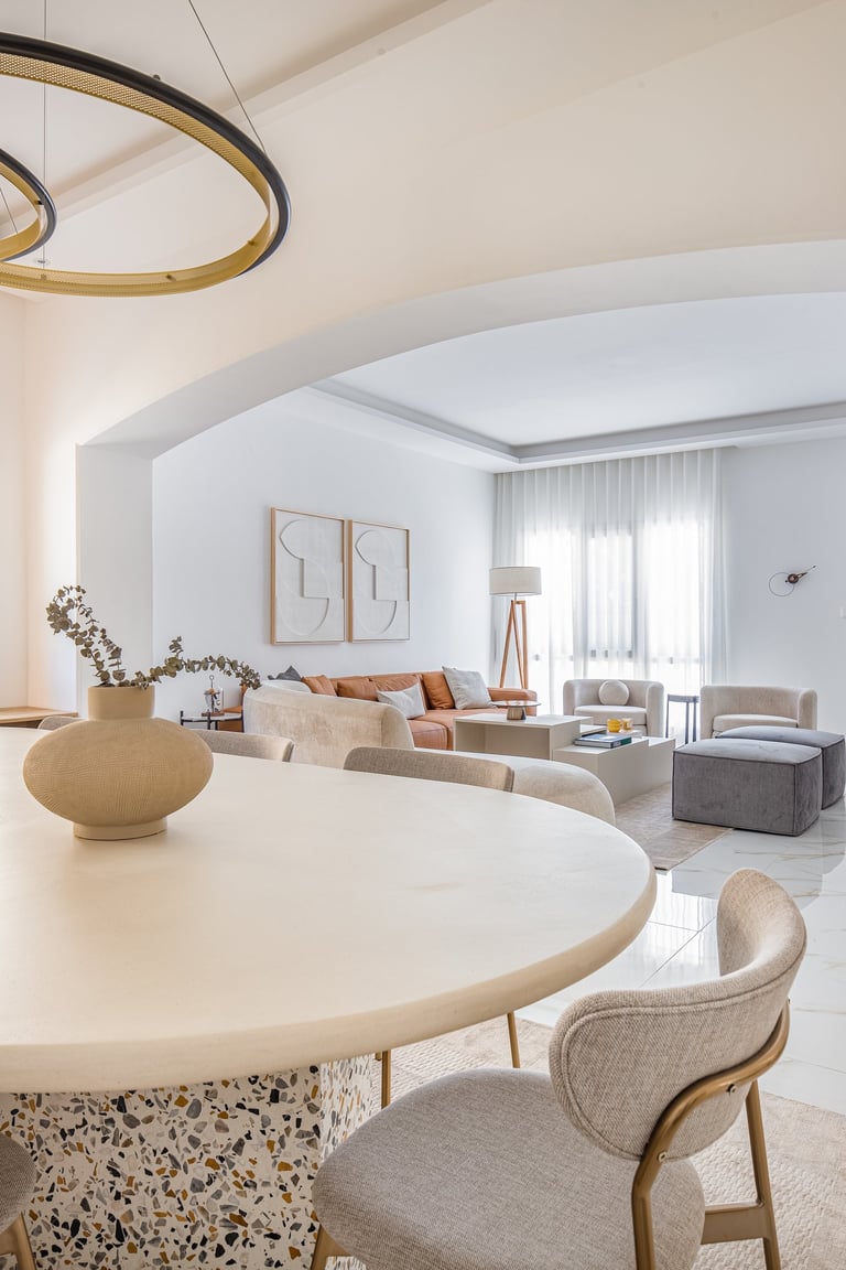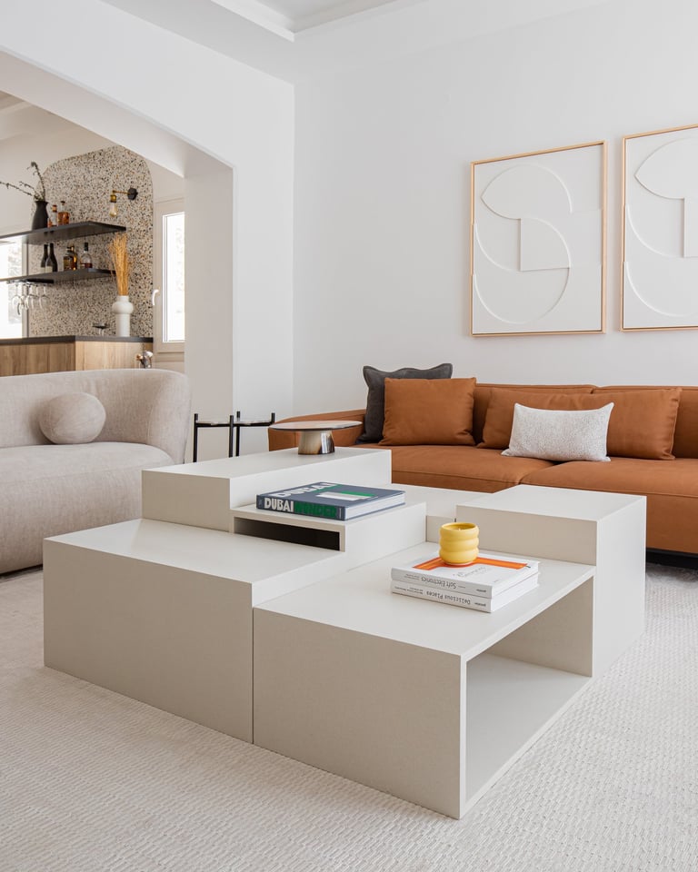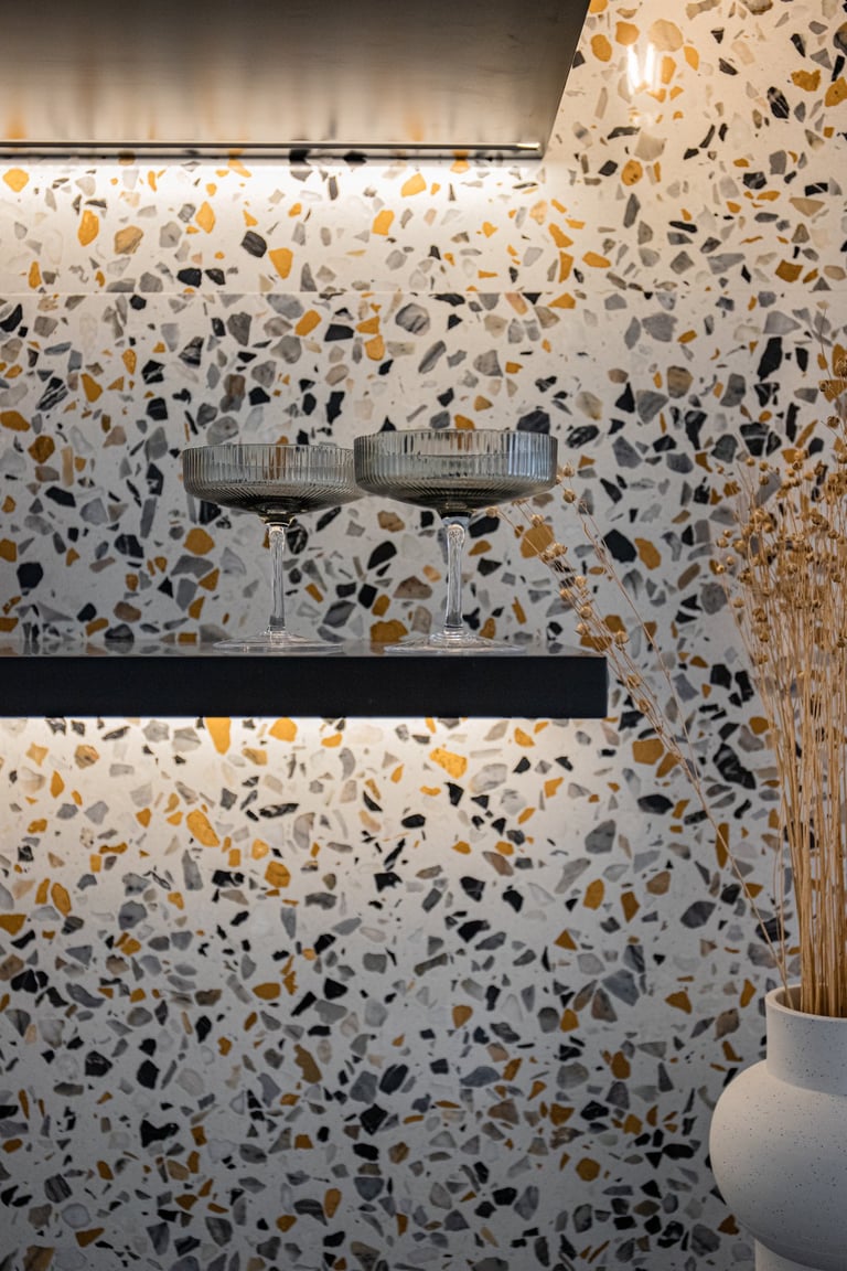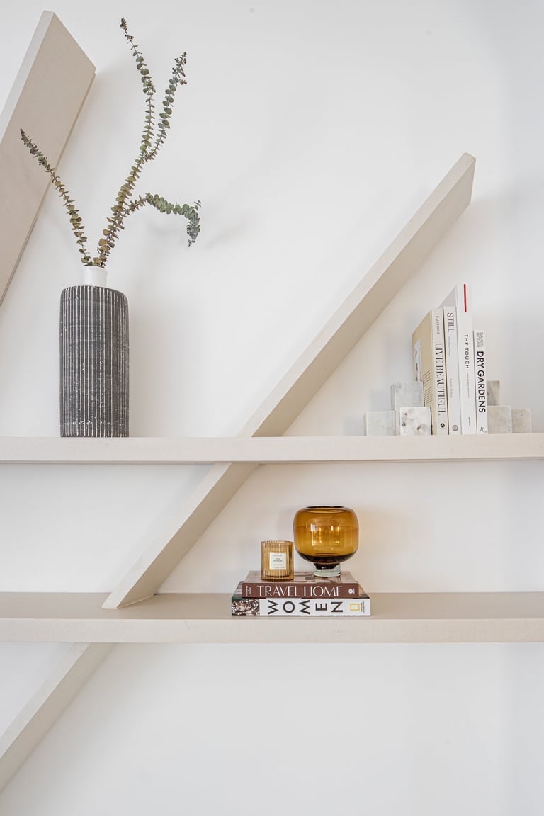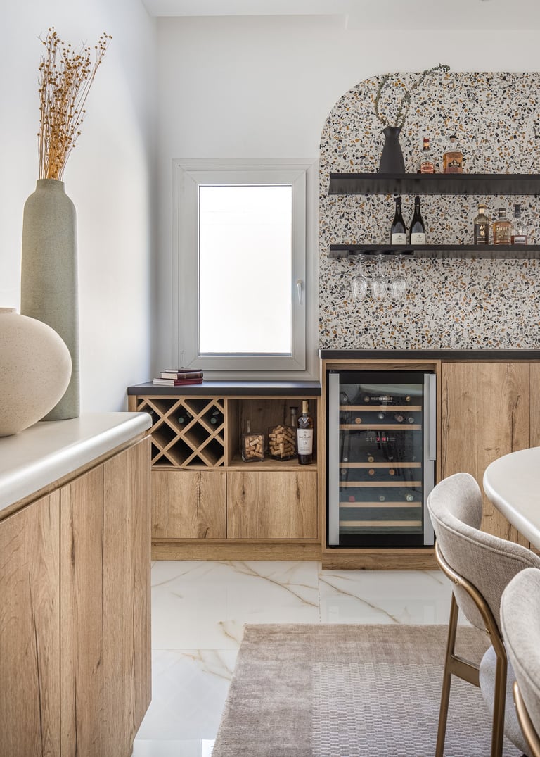 In this contemporary interior, terrazzo and micro-cement become sculptural statements. A falling shelf unit, with slates tilted at 45 degrees, creates a cascading visual effect, serving as both storage and a decorative wall feature. It blends seamlessly with a soft, inviting living area anchored by a large seating arrangement and a modular coffee table, whose sections can double as side tables for function and aesthetic. A bespoke bar with an arched terrazzo backdrop links the space, while warm wood, soft textures, and diffused light balance the dynamic geometry, creating a calm yet visually engaging composition.