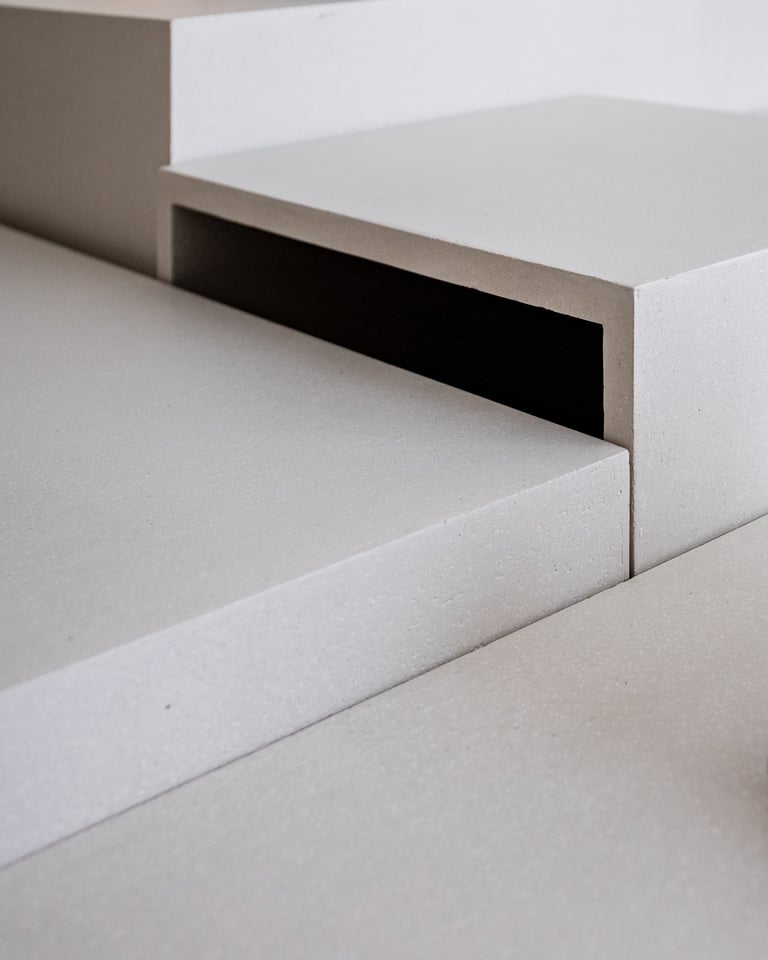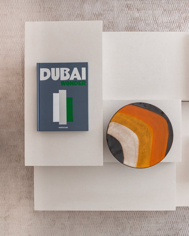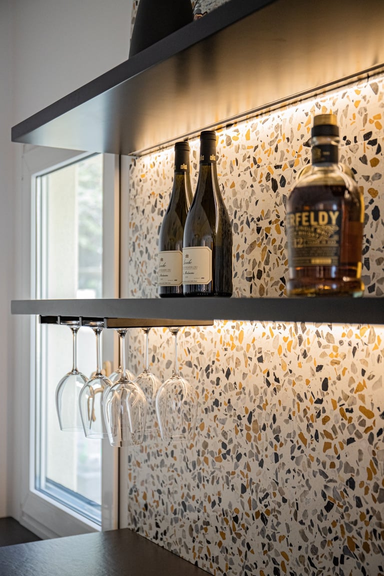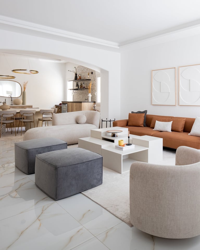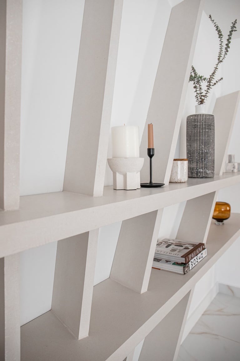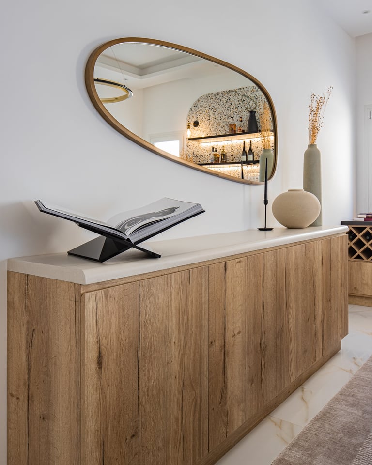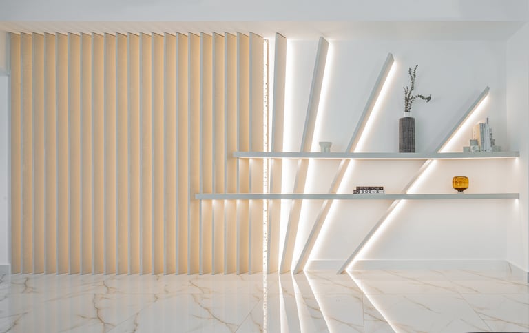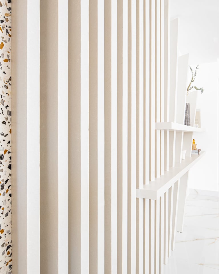 In this contemporary interior, terrazzo and micro-cement become sculptural statements. A falling shelf unit, with slates tilted at 45 degrees, creates a cascading visual effect, serving as both storage and a decorative wall feature. It blends seamlessly with a soft, inviting living area anchored by a large seating arrangement and a modular coffee table, whose sections can double as side tables for function and aesthetic. A bespoke bar with an arched terrazzo backdrop links the space, while warm wood, soft textures, and diffused light balance the dynamic geometry, creating a calm yet visually engaging composition.