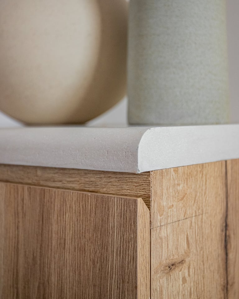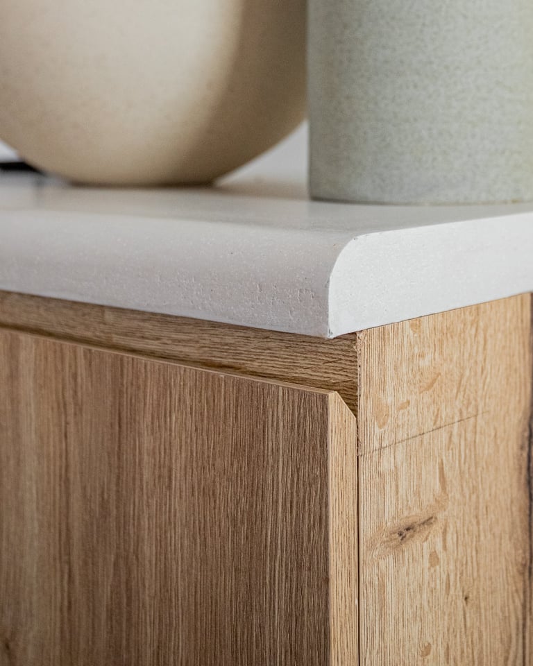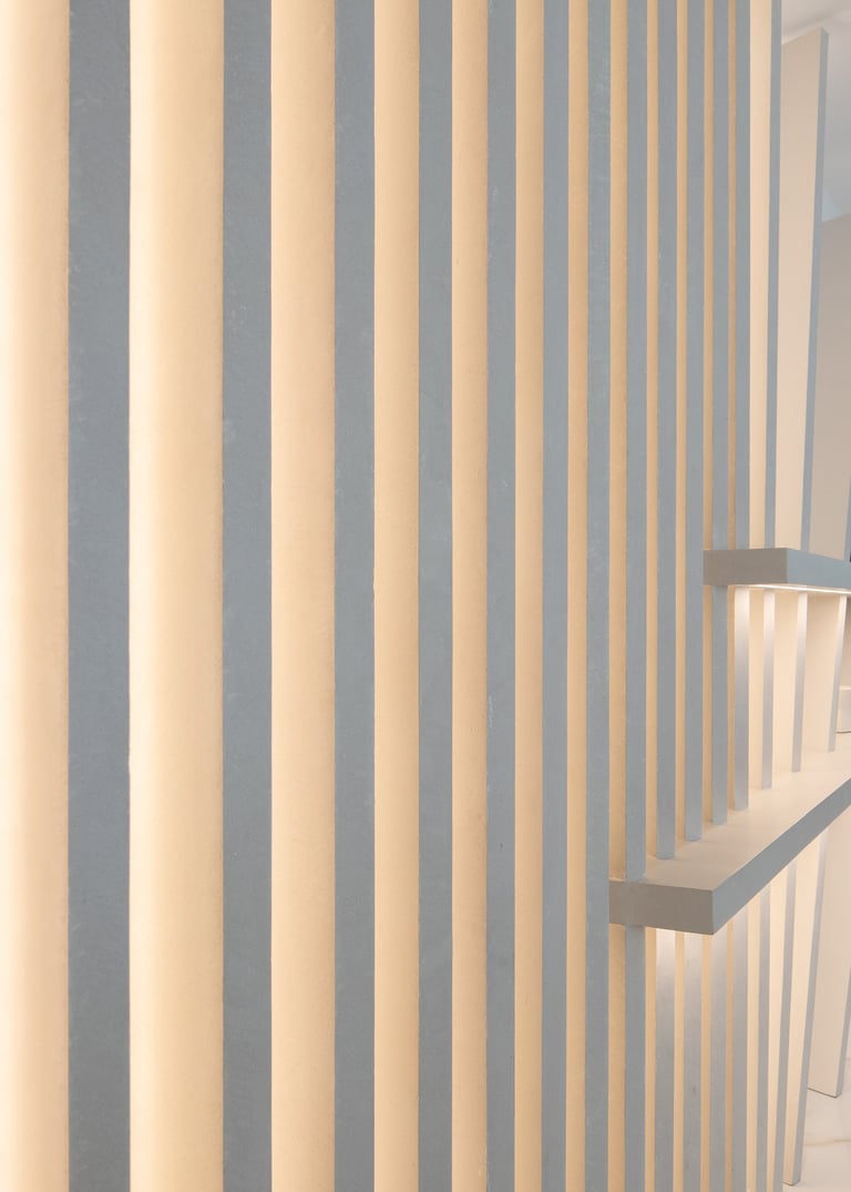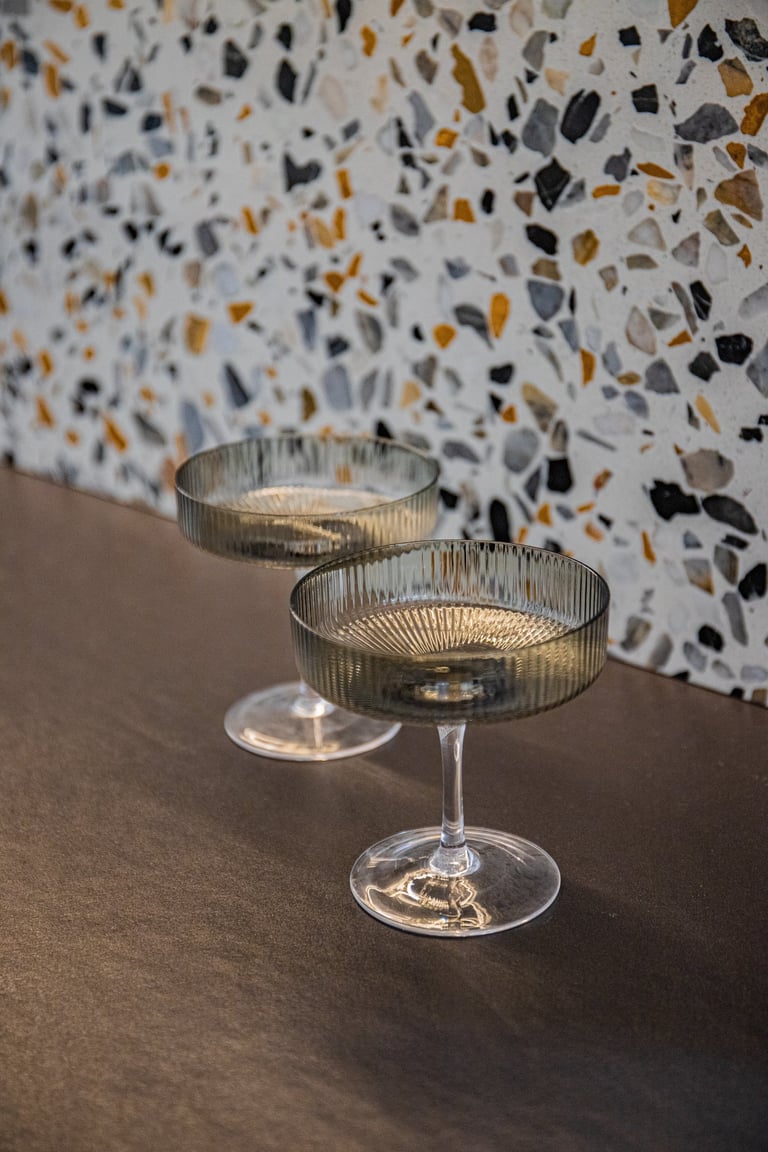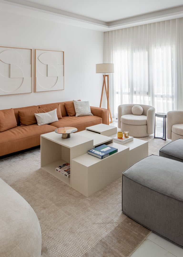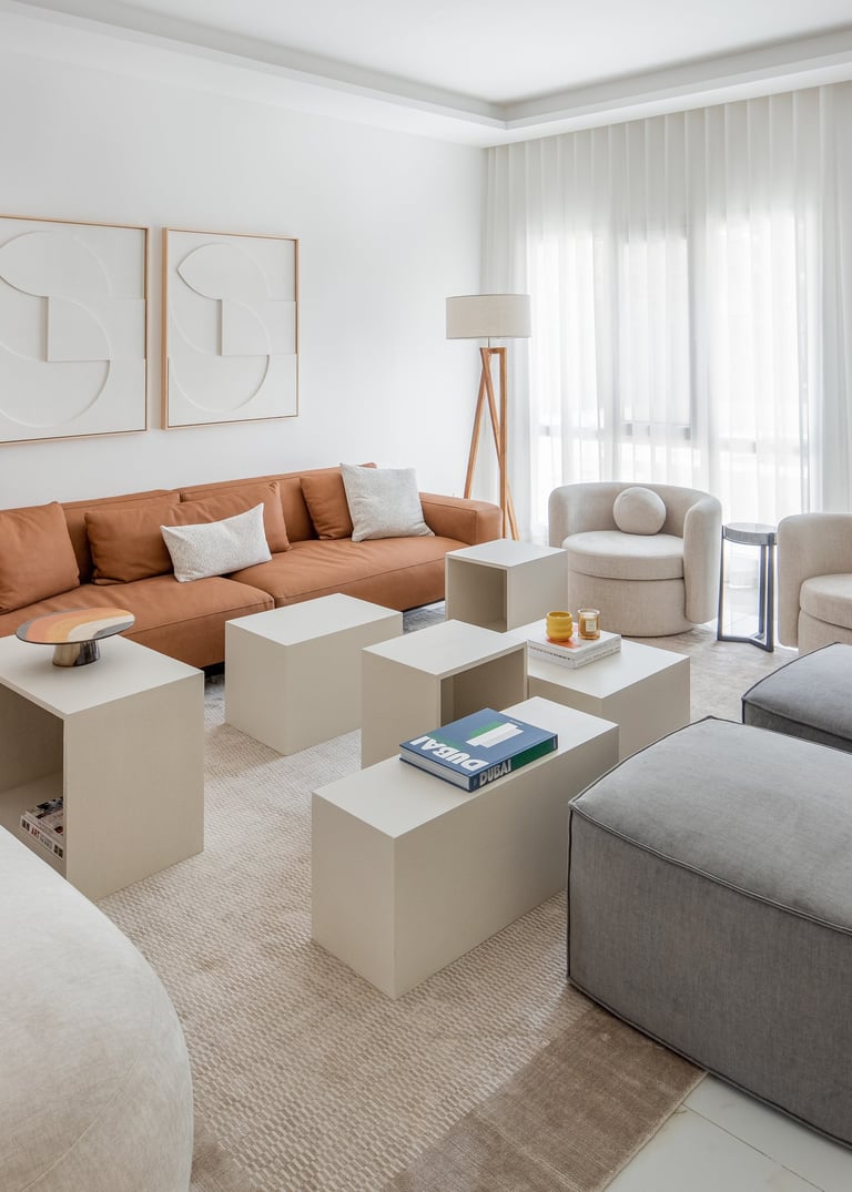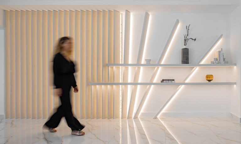 In this contemporary interior, terrazzo and micro-cement become sculptural statements. A falling shelf unit, with slates tilted at 45 degrees, creates a cascading visual effect, serving as both storage and a decorative wall feature. It blends seamlessly with a soft, inviting living area anchored by a large seating arrangement and a modular coffee table, whose sections can double as side tables for function and aesthetic. A bespoke bar with an arched terrazzo backdrop links the space, while warm wood, soft textures, and diffused light balance the dynamic geometry, creating a calm yet visually engaging composition.