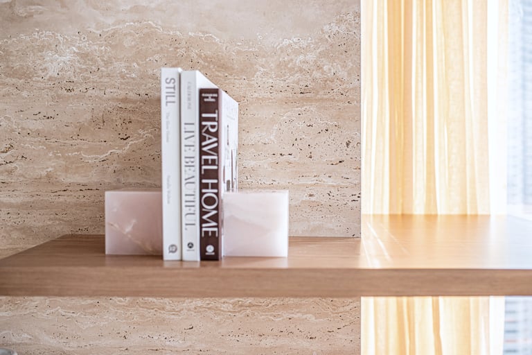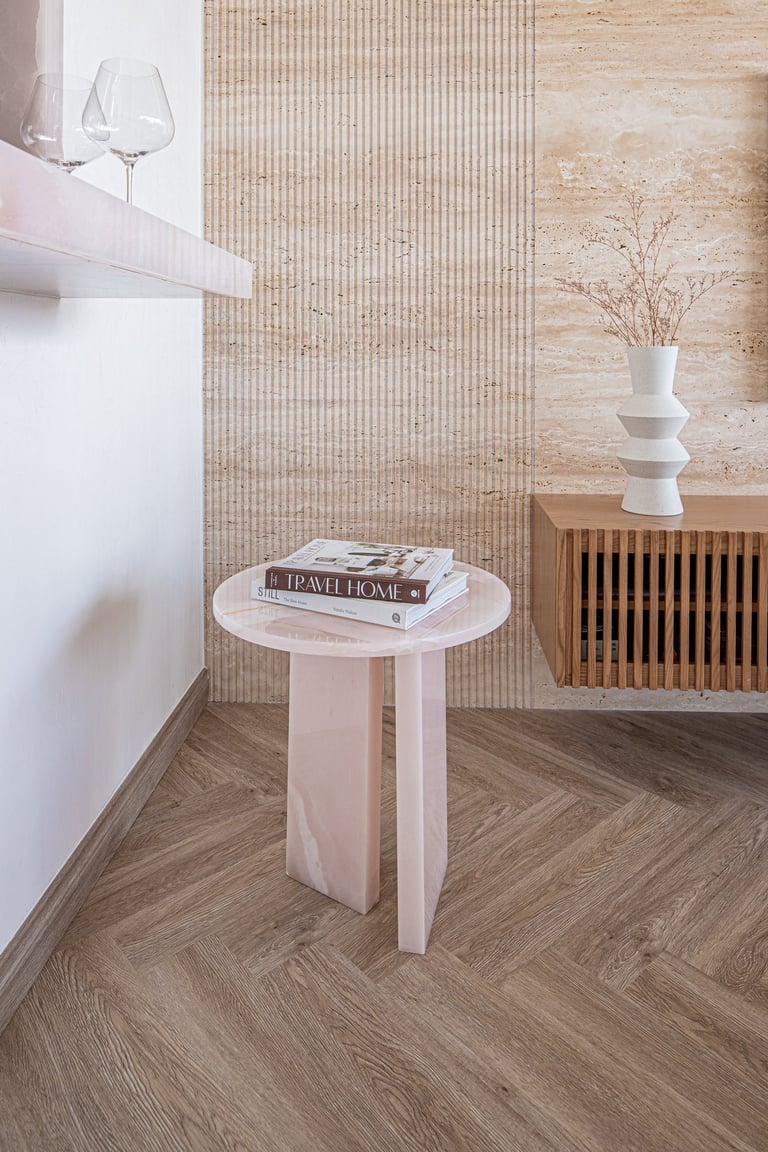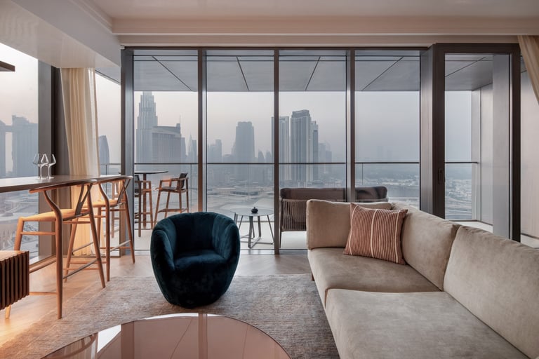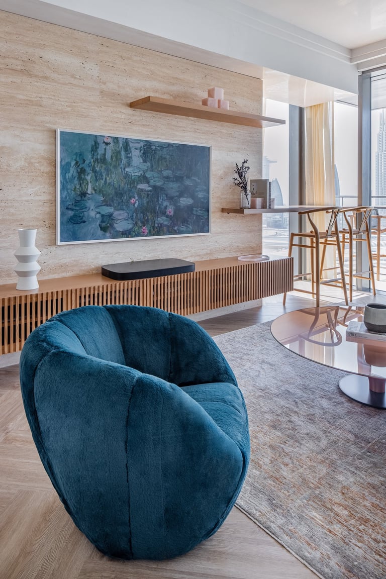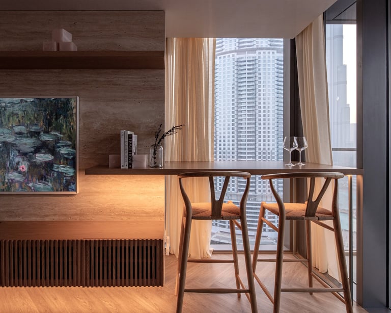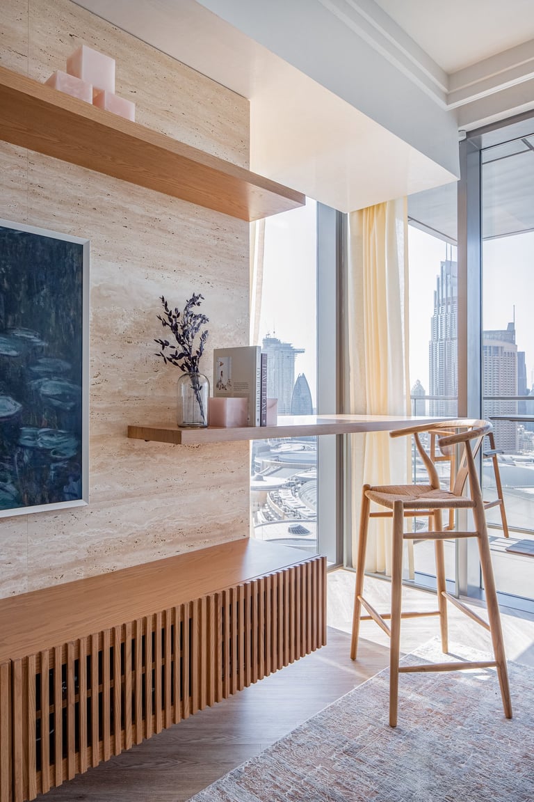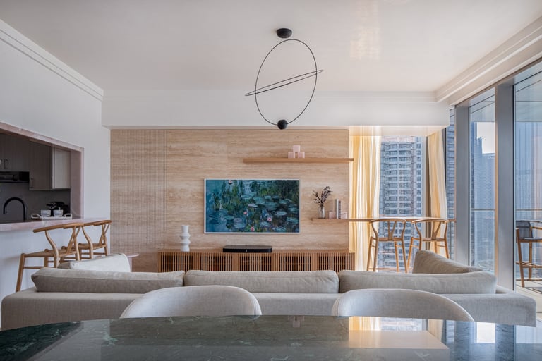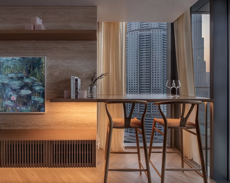An elegant interplay of light oak, travertine, and pink onyx defines this refined and contemporary interior. The engraved travertine TV wall extends seamlessly toward the window, transforming into a sculptural bar that frames panoramic views of the Dubai skyline and the Burj Khalifa. Every element is crafted with precision, from the soft joinery details to the tactile finishes that bring depth and warmth to the space. Colorful artworks punctuate the neutral palette, introducing vibrancy and light that animate the serene atmosphere, resulting in a space that feels both luxurious and inviting.