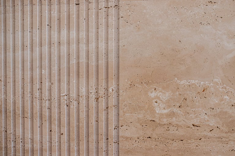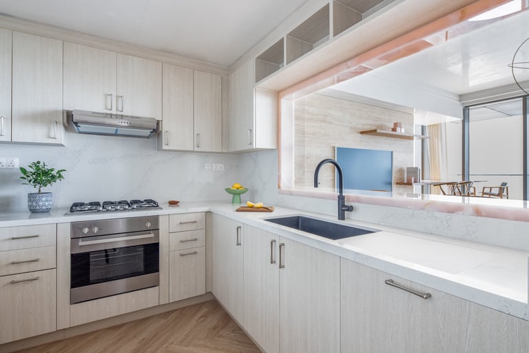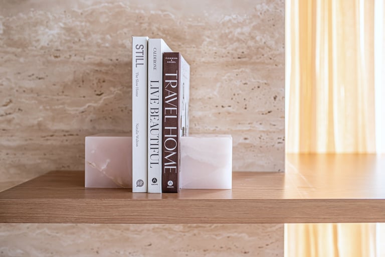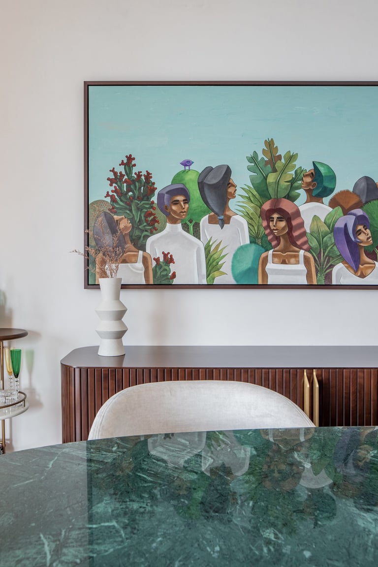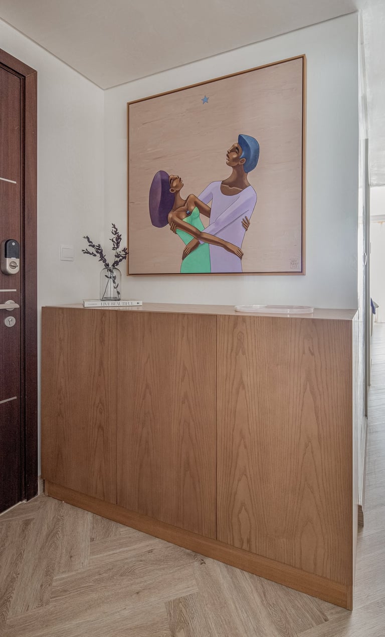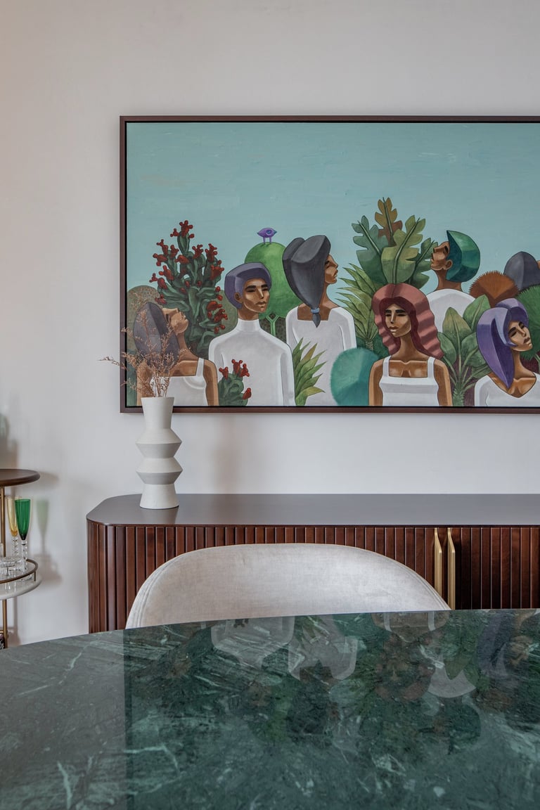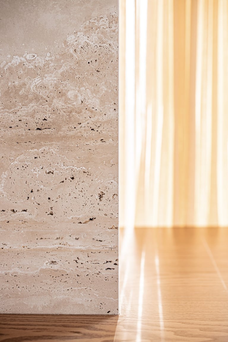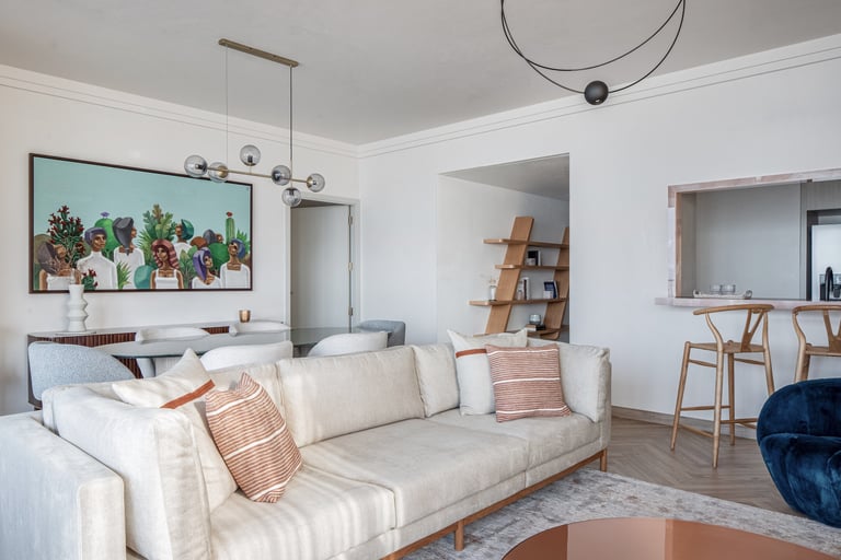 An elegant interplay of light oak, travertine, and pink onyx defines this refined and contemporary interior. The engraved travertine TV wall extends seamlessly toward the window, transforming into a sculptural bar that frames panoramic views of the Dubai skyline and the Burj Khalifa. Every element is crafted with precision, from the soft joinery details to the tactile finishes that bring depth and warmth to the space. Colorful artworks punctuate the neutral palette, introducing vibrancy and light that animate the serene atmosphere, resulting in a space that feels both luxurious and inviting.