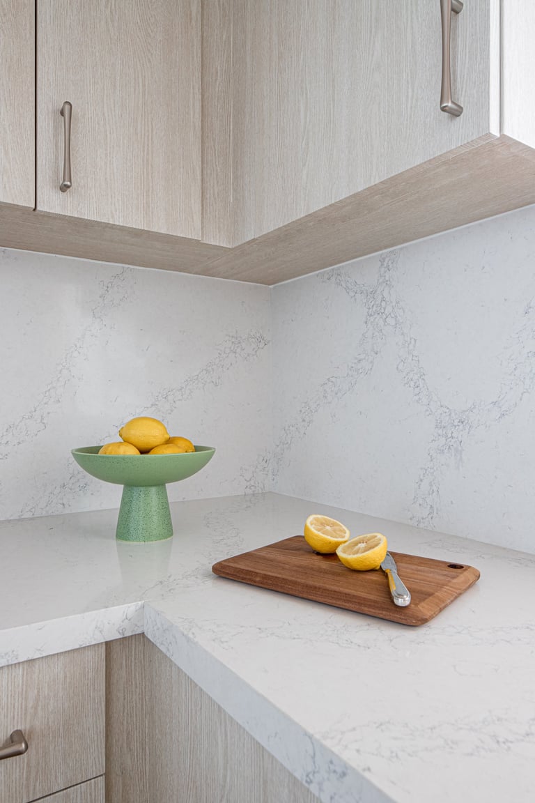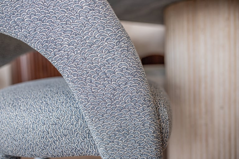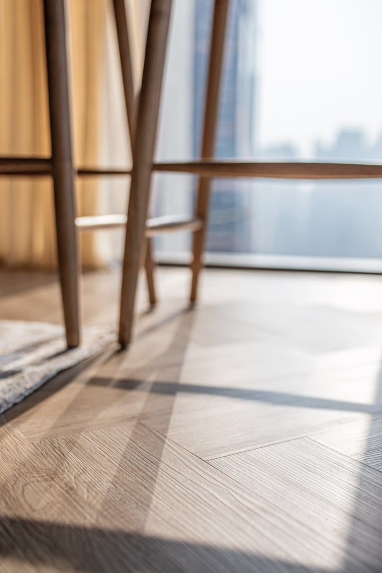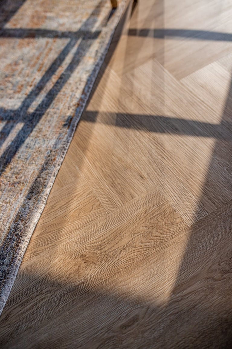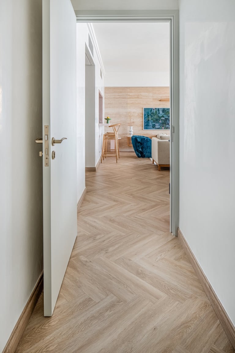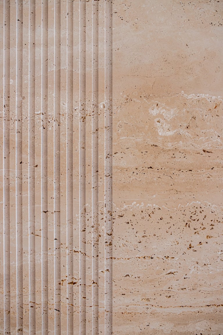 An elegant interplay of light oak, travertine, and pink onyx defines this refined and contemporary interior. The engraved travertine TV wall extends seamlessly toward the window, transforming into a sculptural bar that frames panoramic views of the Dubai skyline and the Burj Khalifa. Every element is crafted with precision, from the soft joinery details to the tactile finishes that bring depth and warmth to the space. Colorful artworks punctuate the neutral palette, introducing vibrancy and light that animate the serene atmosphere, resulting in a space that feels both luxurious and inviting.