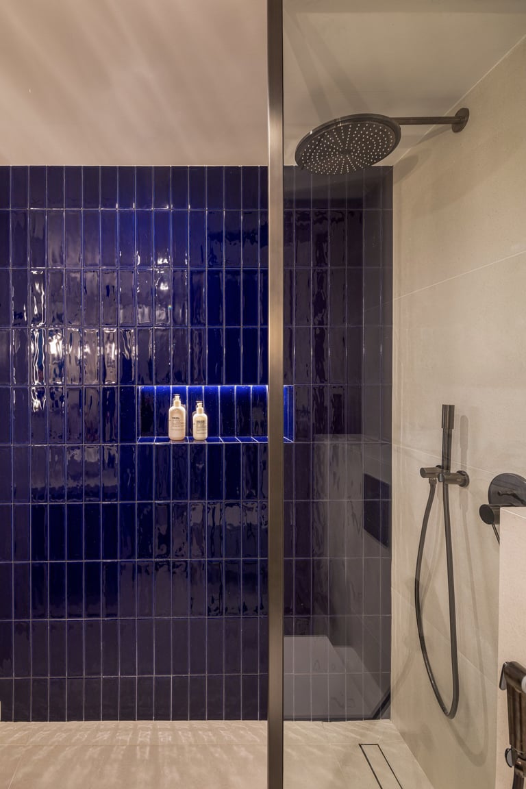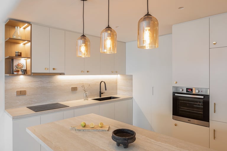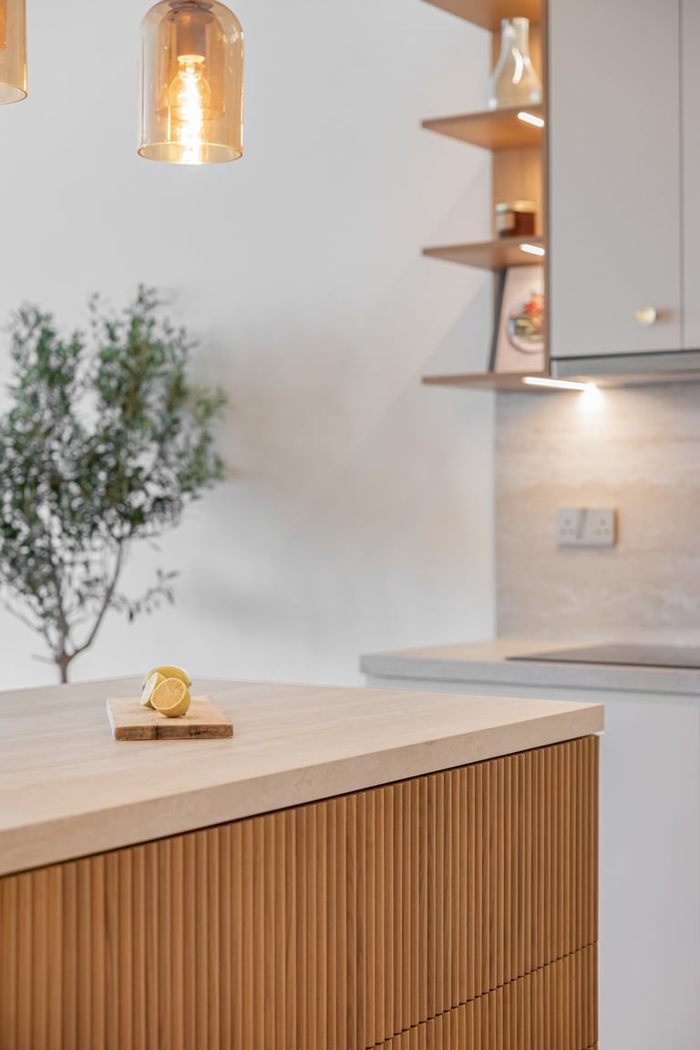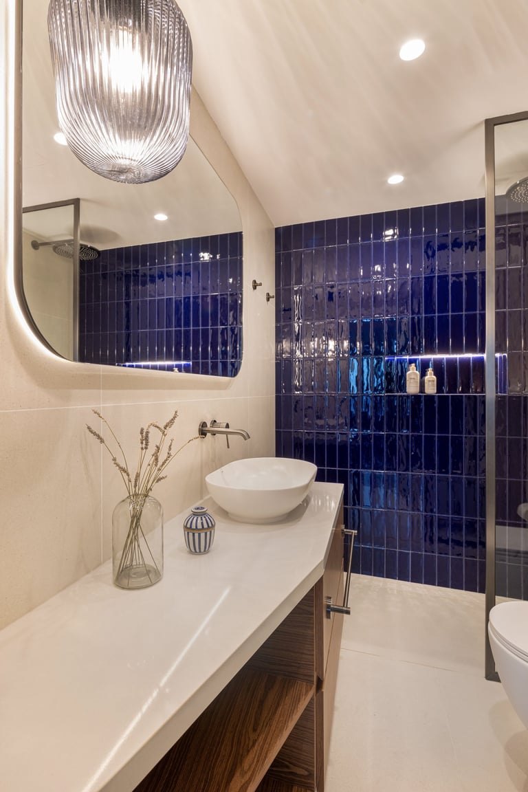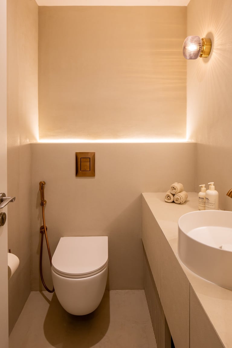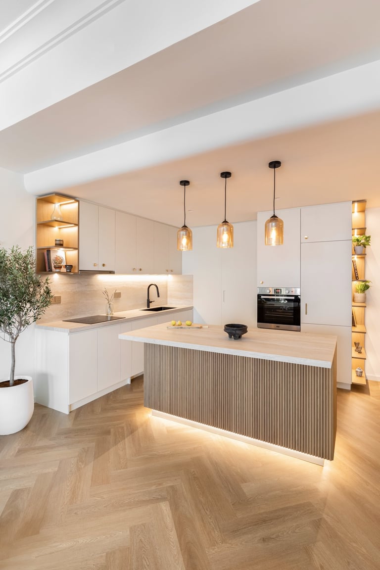 This apartment combines warmth and style with a calm, contemporary feel. The powder room features smooth microcement walls for a sleek, seamless look, complemented by high-end sanitary ware that adds a touch of refinement. In the kitchen, beige cabinets pair beautifully with a travertine countertop and a wood island, creating a balanced mix of natural tones and textures. The master bathroom introduces a bold accent with royal blue tiles in the shower, contrasted with elegant fittings and finishes that enhance the apartment’s understated sophistication.