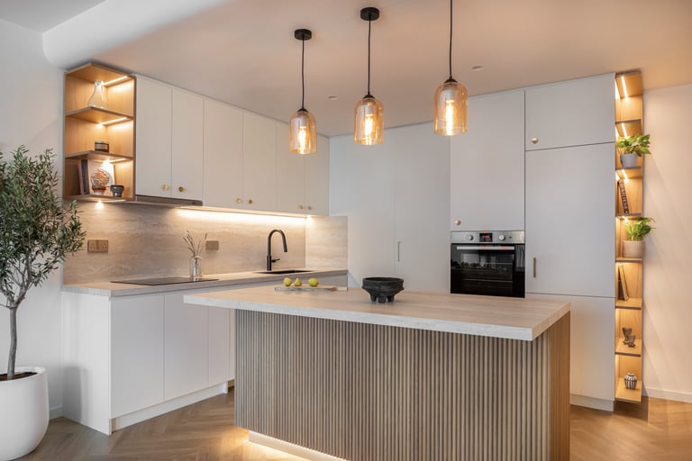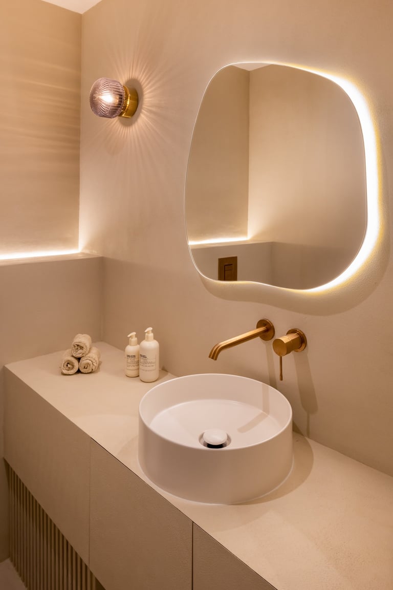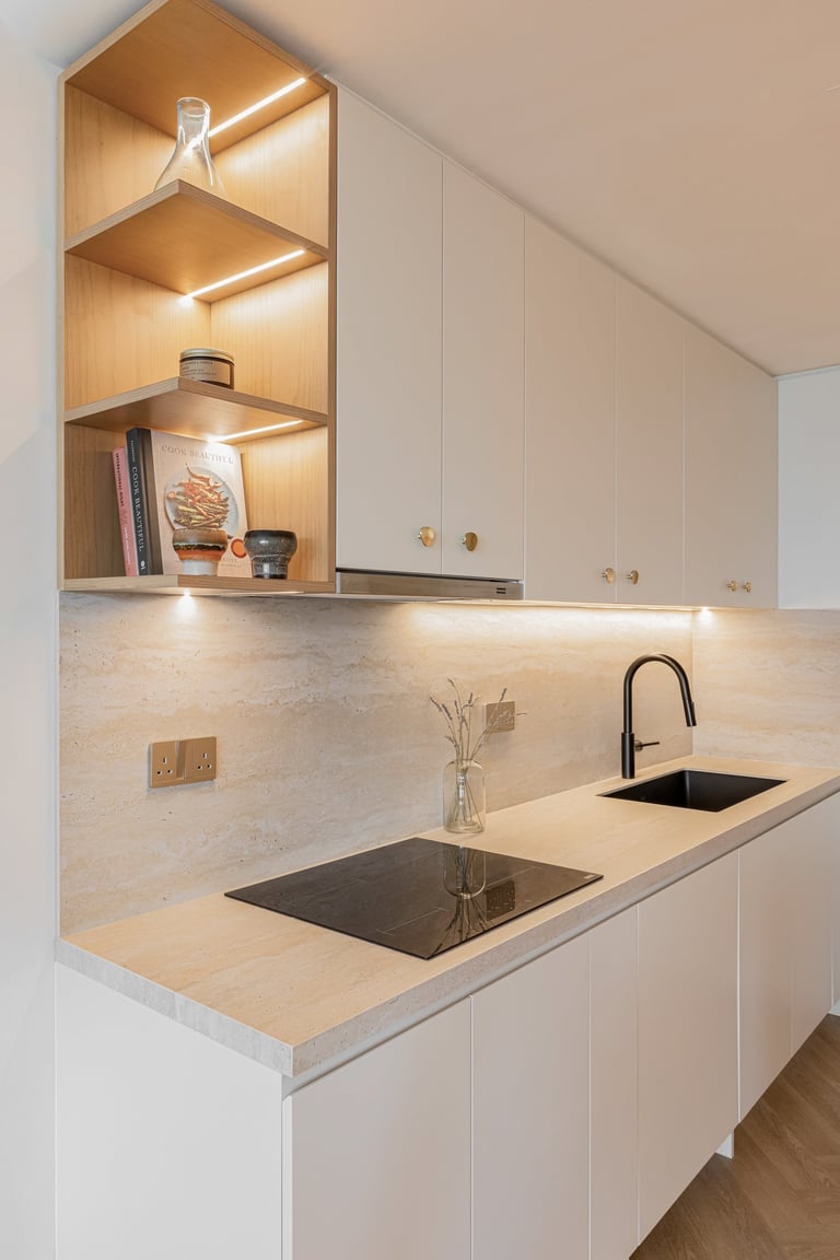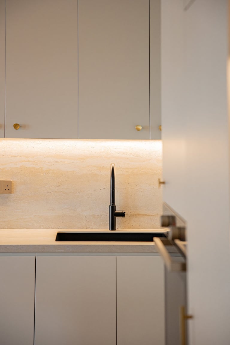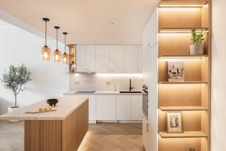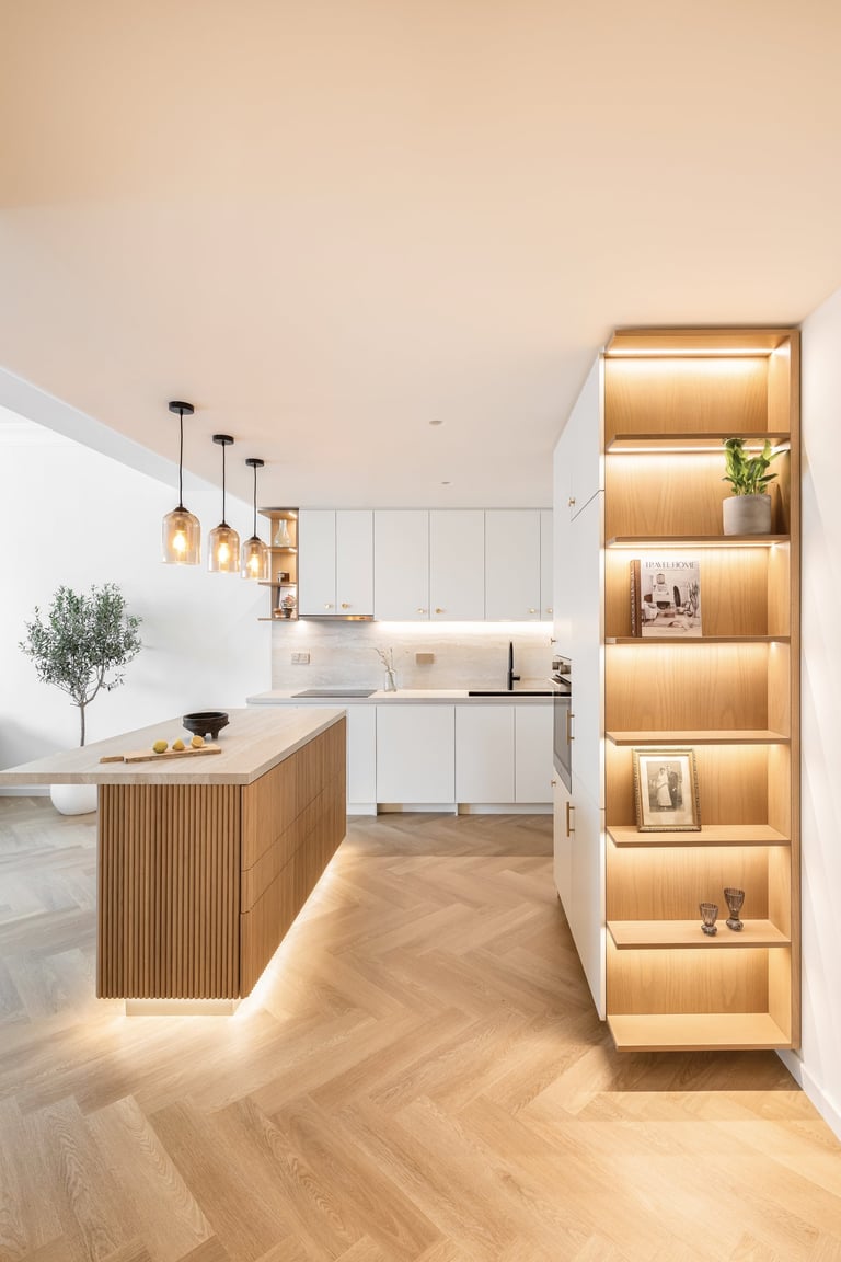 This apartment combines warmth and style with a calm, contemporary feel. The powder room features smooth microcement walls for a sleek, seamless look, complemented by high-end sanitary ware that adds a touch of refinement. In the kitchen, beige cabinets pair beautifully with a travertine countertop and a wood island, creating a balanced mix of natural tones and textures. The master bathroom introduces a bold accent with royal blue tiles in the shower, contrasted with elegant fittings and finishes that enhance the apartment’s understated sophistication.