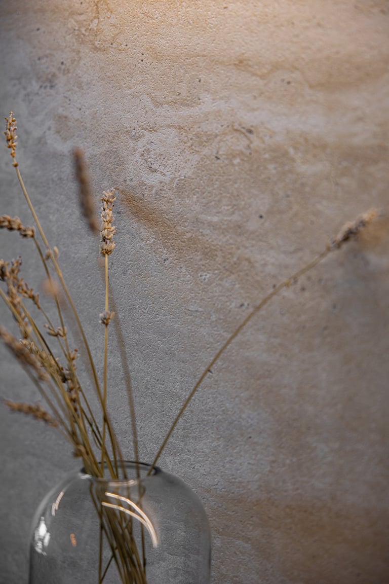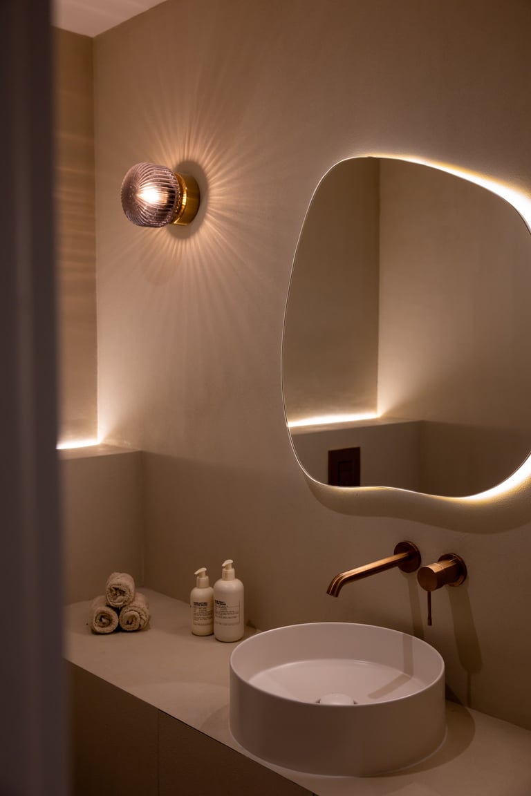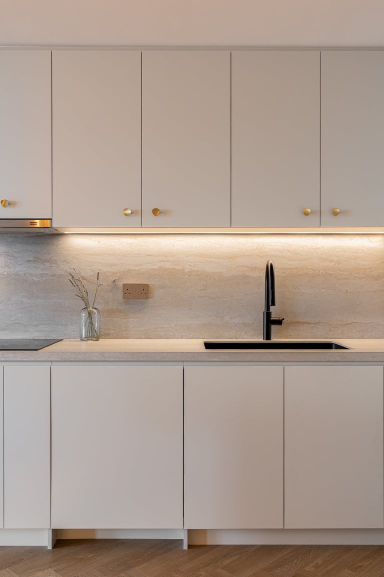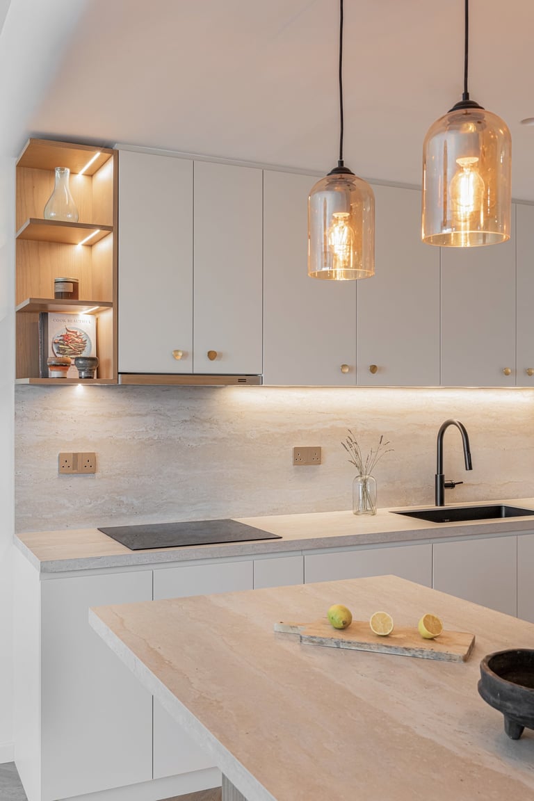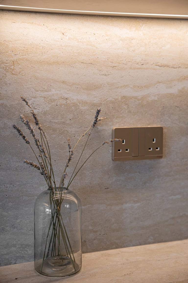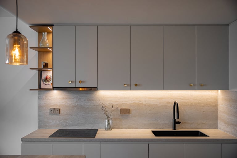 This apartment combines warmth and style with a calm, contemporary feel. The powder room features smooth microcement walls for a sleek, seamless look, complemented by high-end sanitary ware that adds a touch of refinement. In the kitchen, beige cabinets pair beautifully with a travertine countertop and a wood island, creating a balanced mix of natural tones and textures. The master bathroom introduces a bold accent with royal blue tiles in the shower, contrasted with elegant fittings and finishes that enhance the apartment’s understated sophistication.
